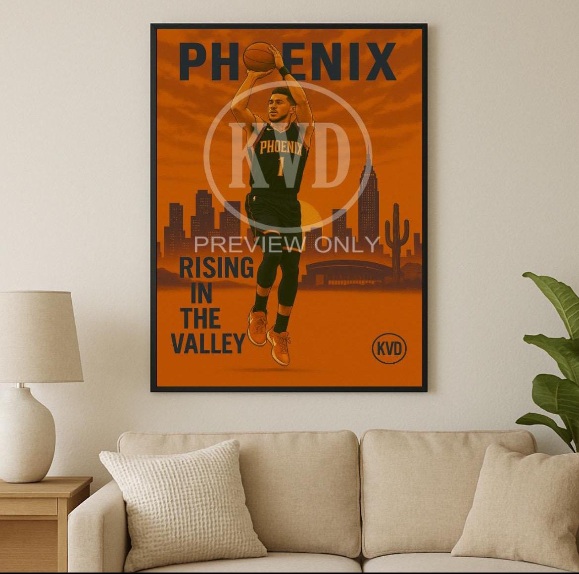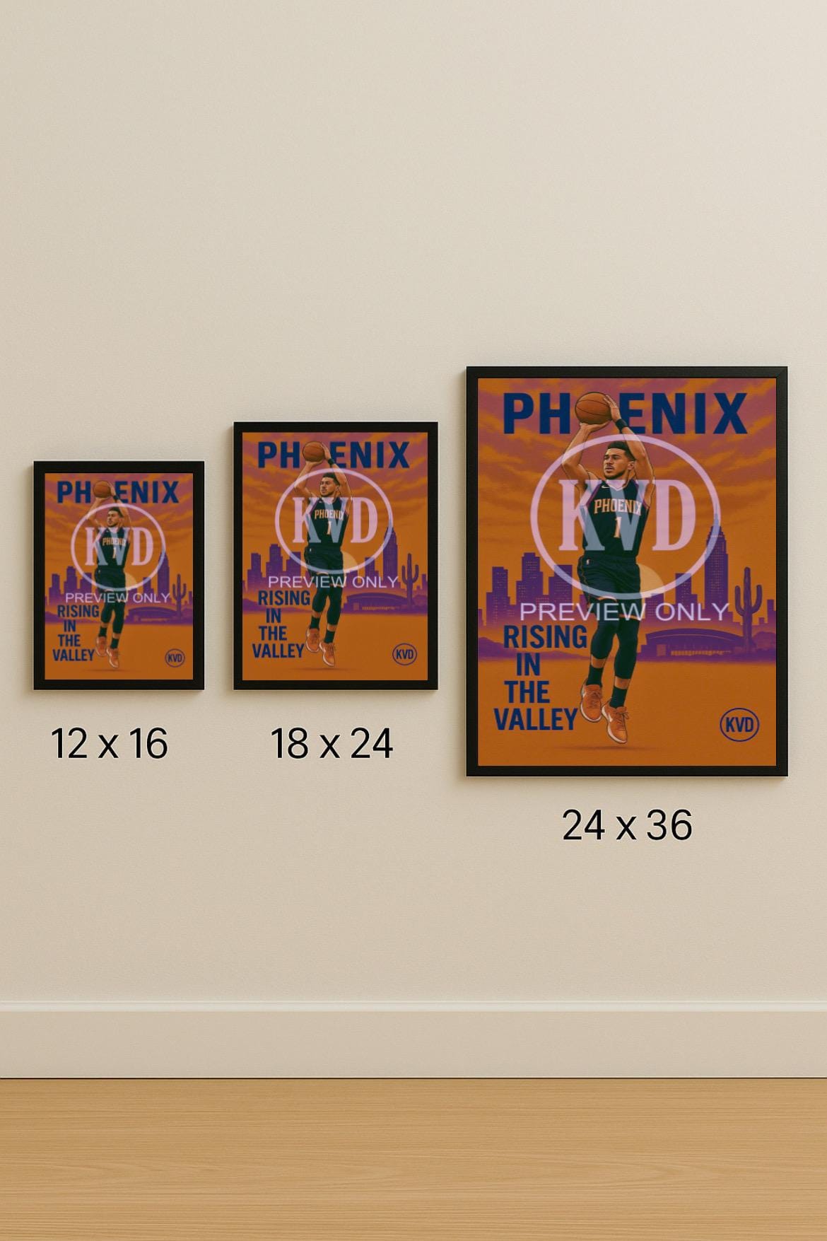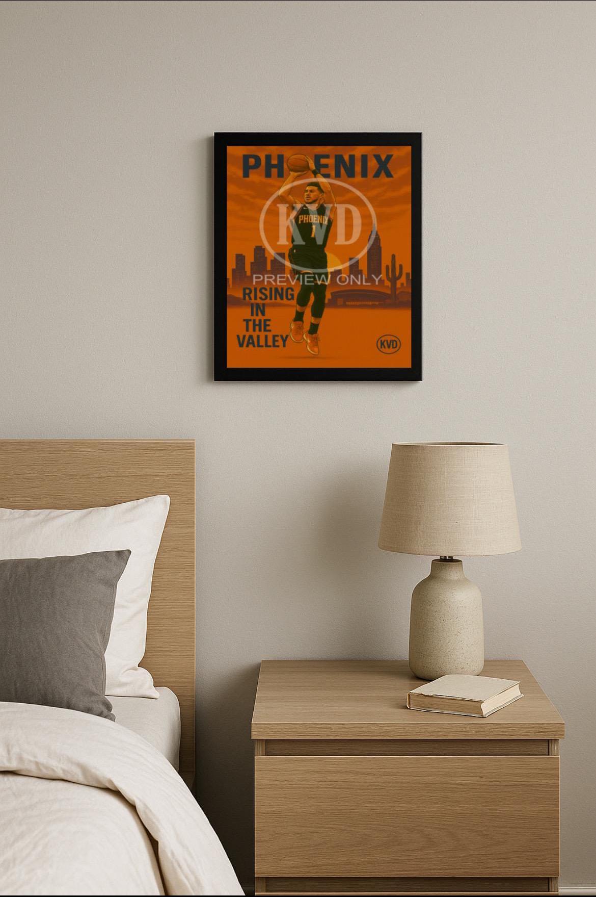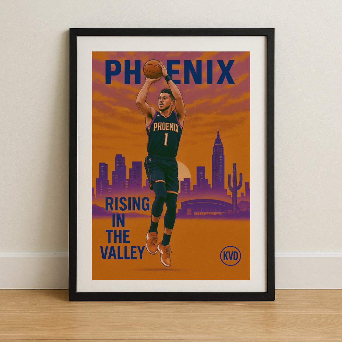 Bring your walls to life with this bold, illustrated poster featuring a poised full-body pose above the Phoenix skyline. Designed with illustrated realism and desert fire, this premium print captures the calm confidence, scoring precision, and grit of a true franchise star.