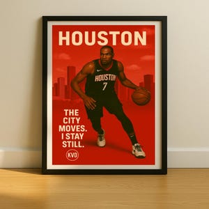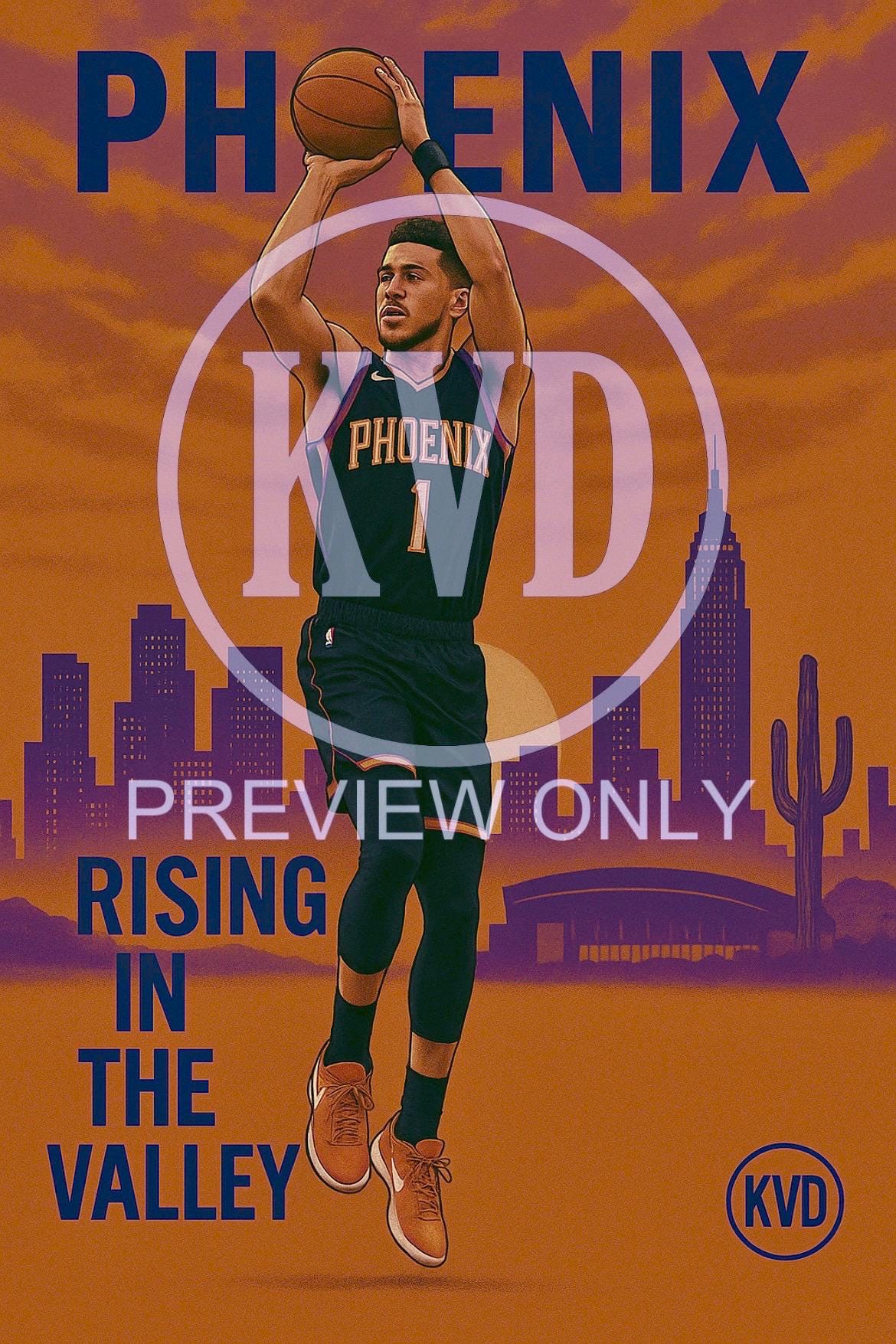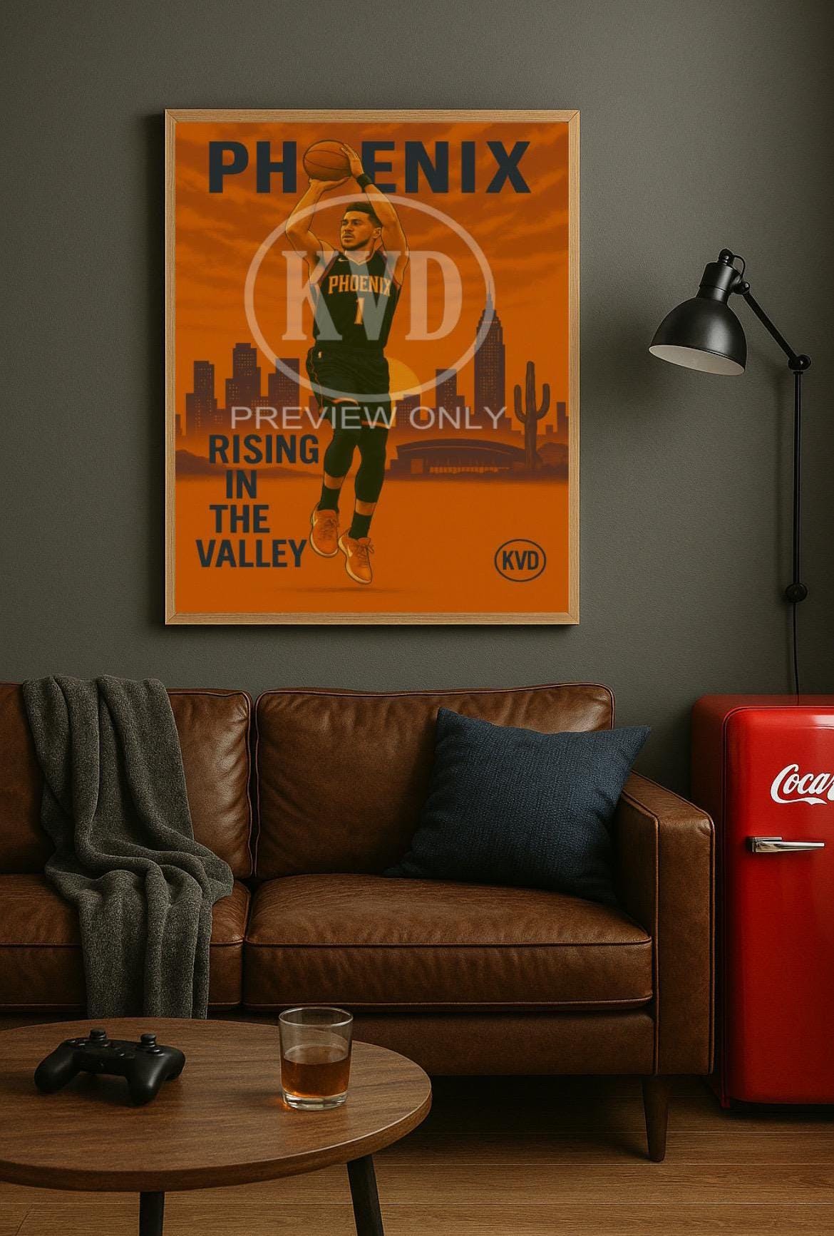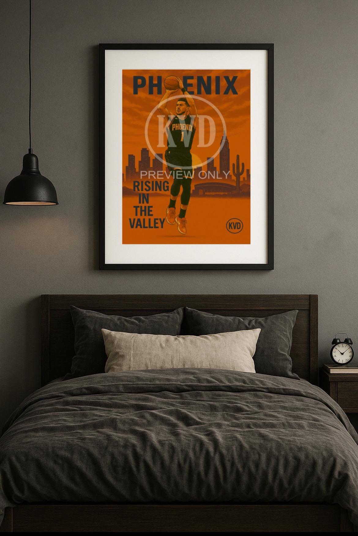 Bring your walls to life with this bold, illustrated poster featuring a poised full-body pose above the Phoenix skyline. Designed with illustrated realism and desert fire, this premium print captures the calm confidence, scoring precision, and grit of a true franchise star.