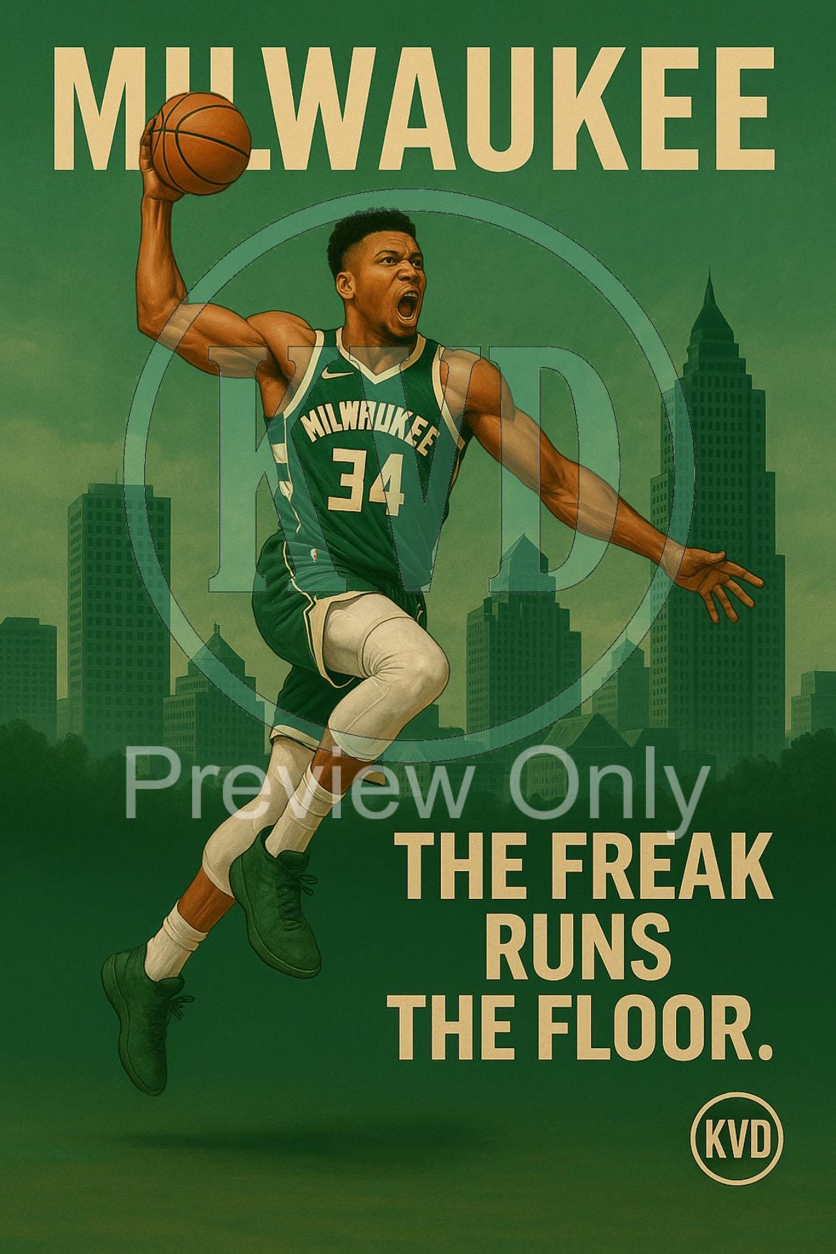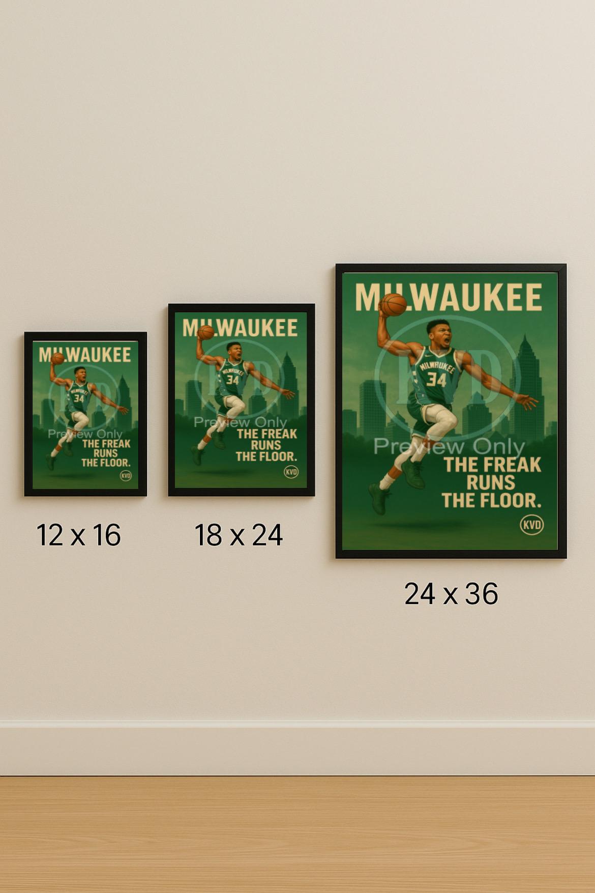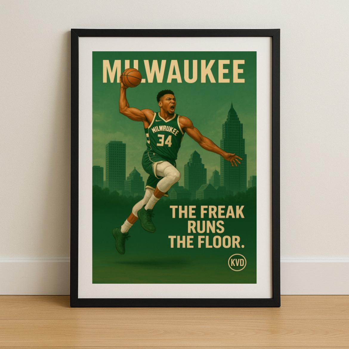 Bring your walls to life with this bold, illustrated poster featuring a basketball icon charging above the Milwaukee skyline. Crafted in rich green tones with powerful illustrated realism, this premium print captures speed, strength, and the controlled chaos that defines the city’s finest.