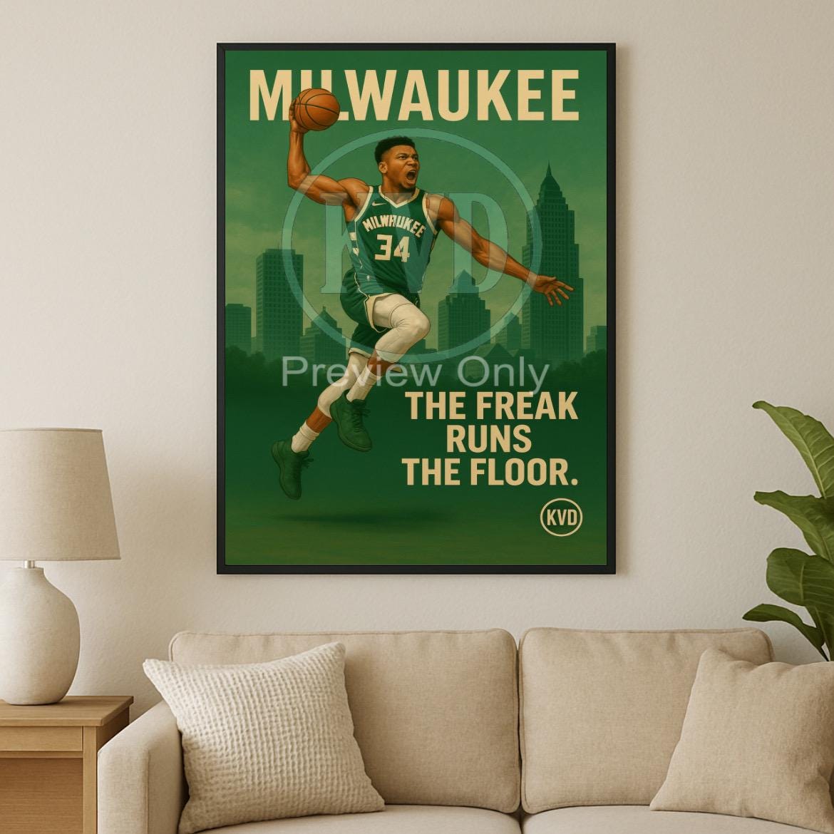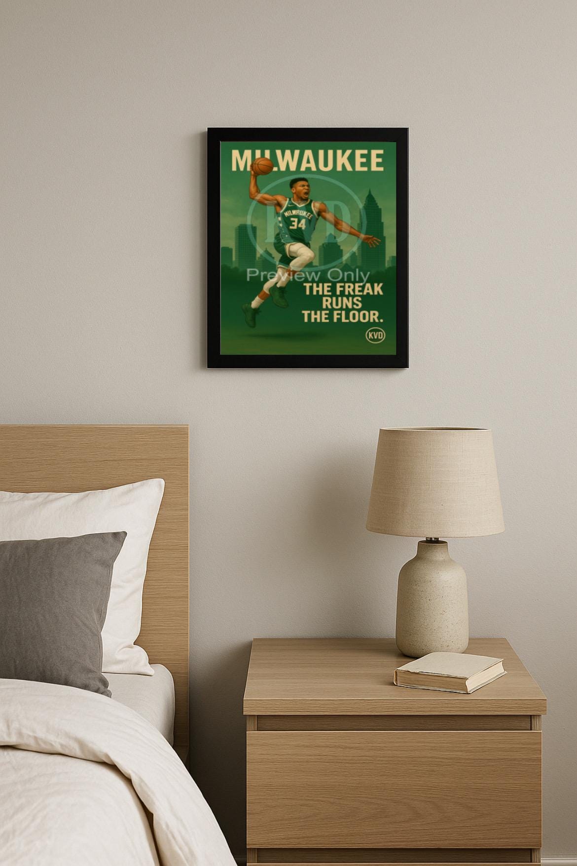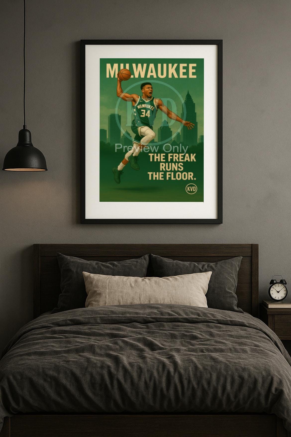 Bring your walls to life with this bold, illustrated poster featuring a basketball icon charging above the Milwaukee skyline. Crafted in rich green tones with powerful illustrated realism, this premium print captures speed, strength, and the controlled chaos that defines the city’s finest.