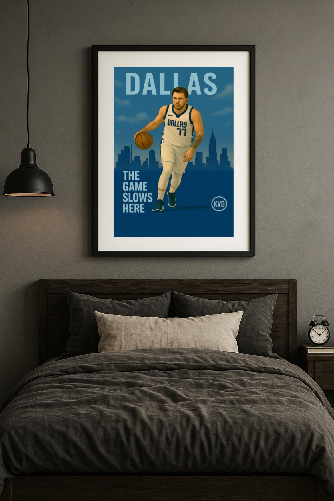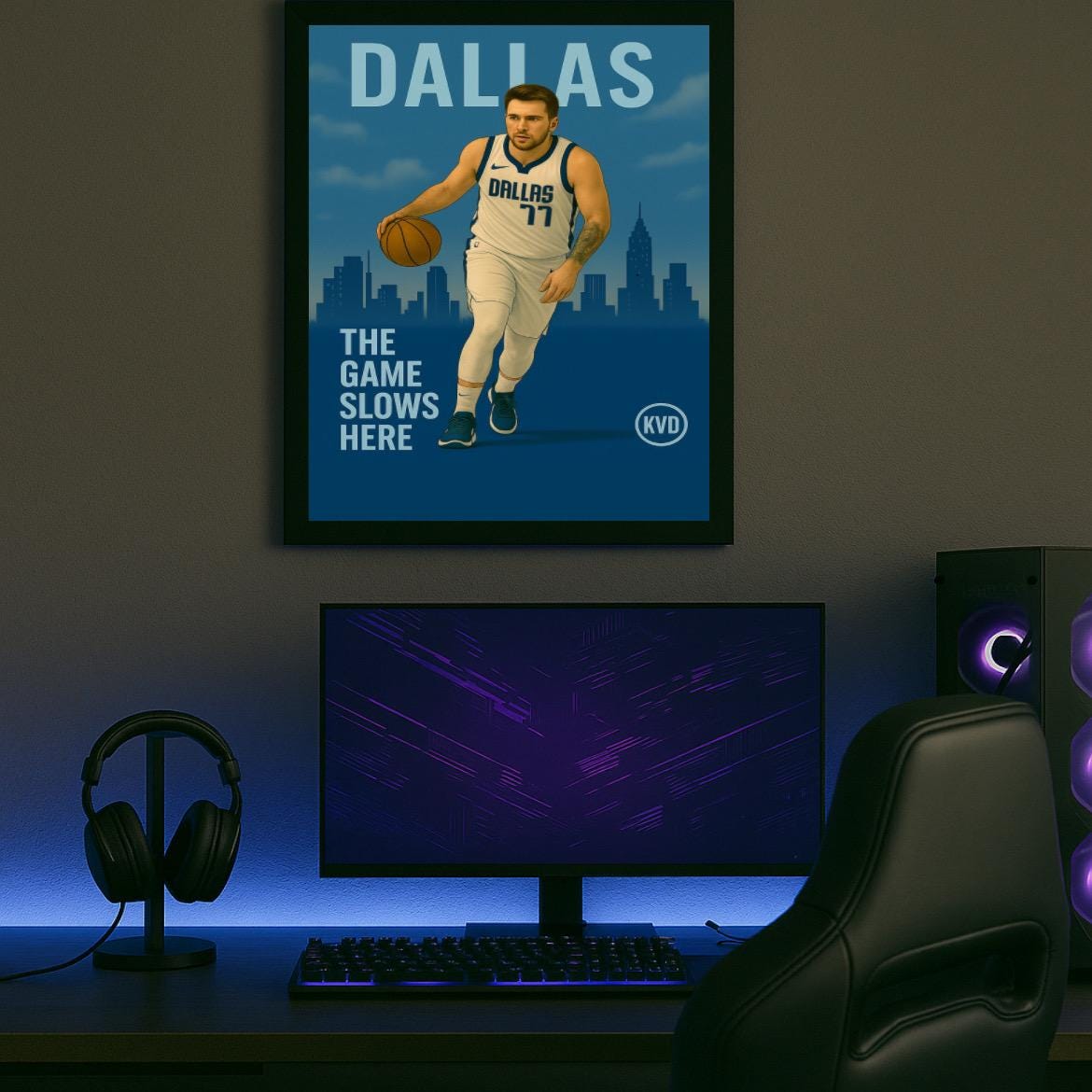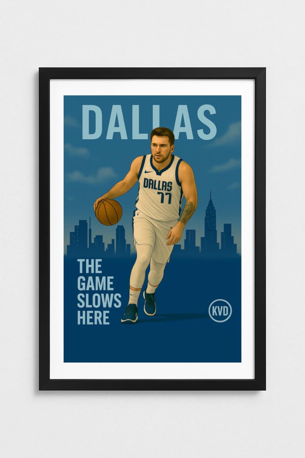 Bring your walls to life with this bold, illustrated poster featuring a basketball icon commanding the Dallas skyline. Designed with illustrated realism and icy confidence, this premium print captures Luka Dončić’s signature pace, control, and calm dominance on the Lone Star stage.