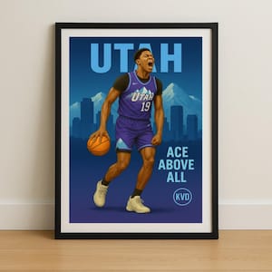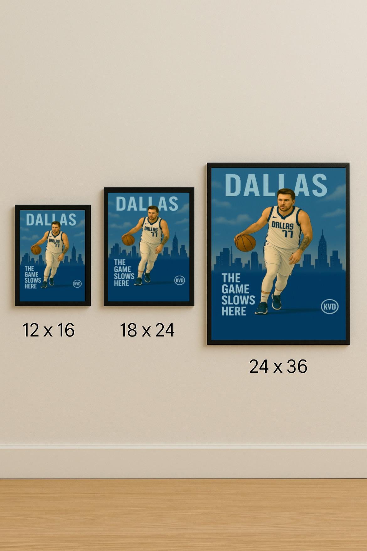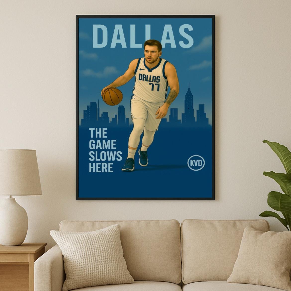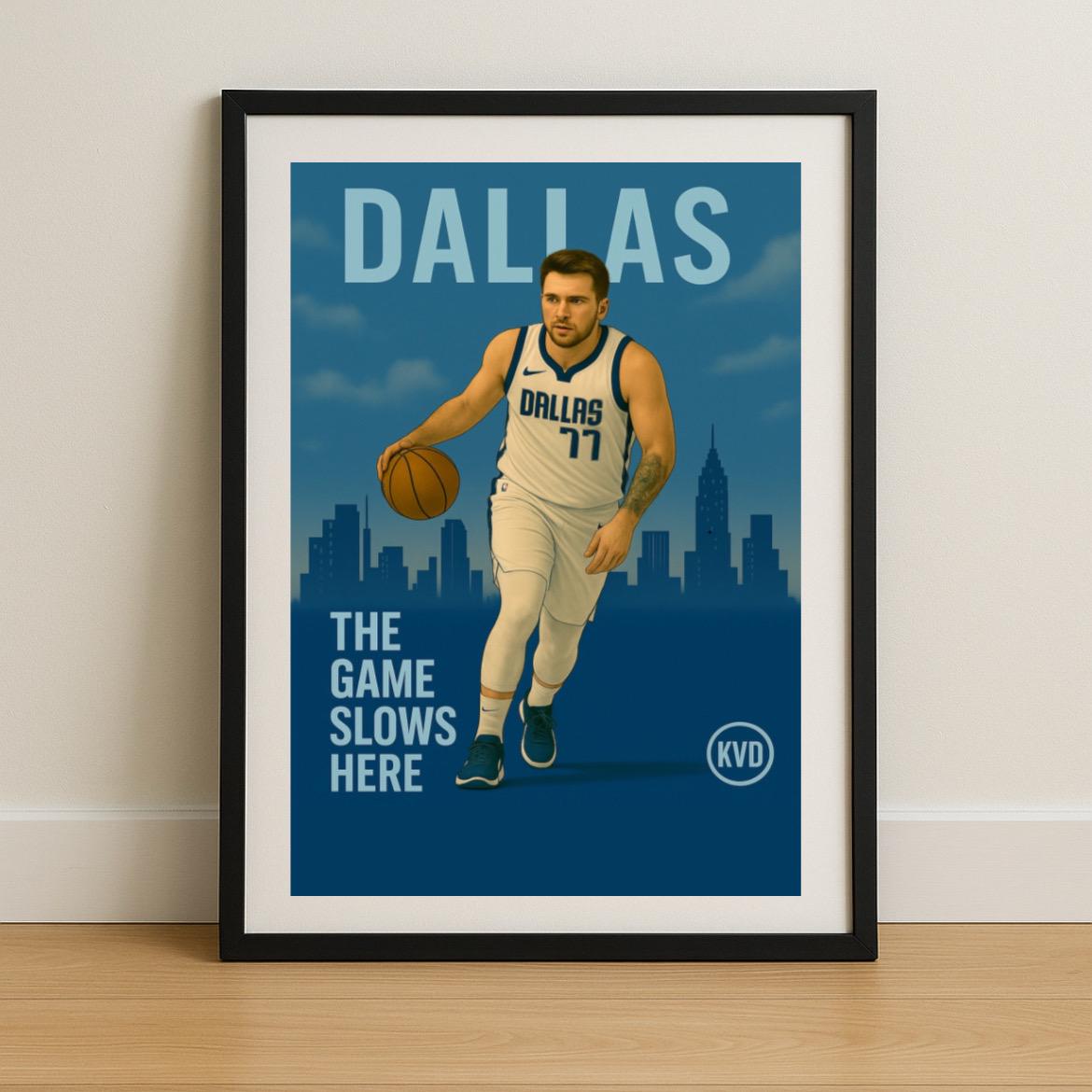 Bring your walls to life with this bold, illustrated poster featuring a basketball icon commanding the Dallas skyline. Designed with illustrated realism and icy confidence, this premium print captures Luka Dončić’s signature pace, control, and calm dominance on the Lone Star stage.