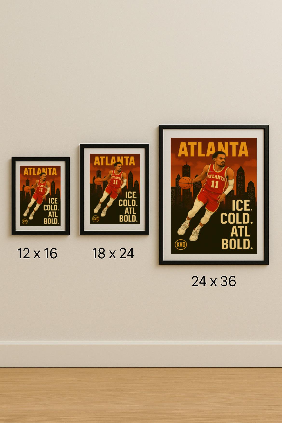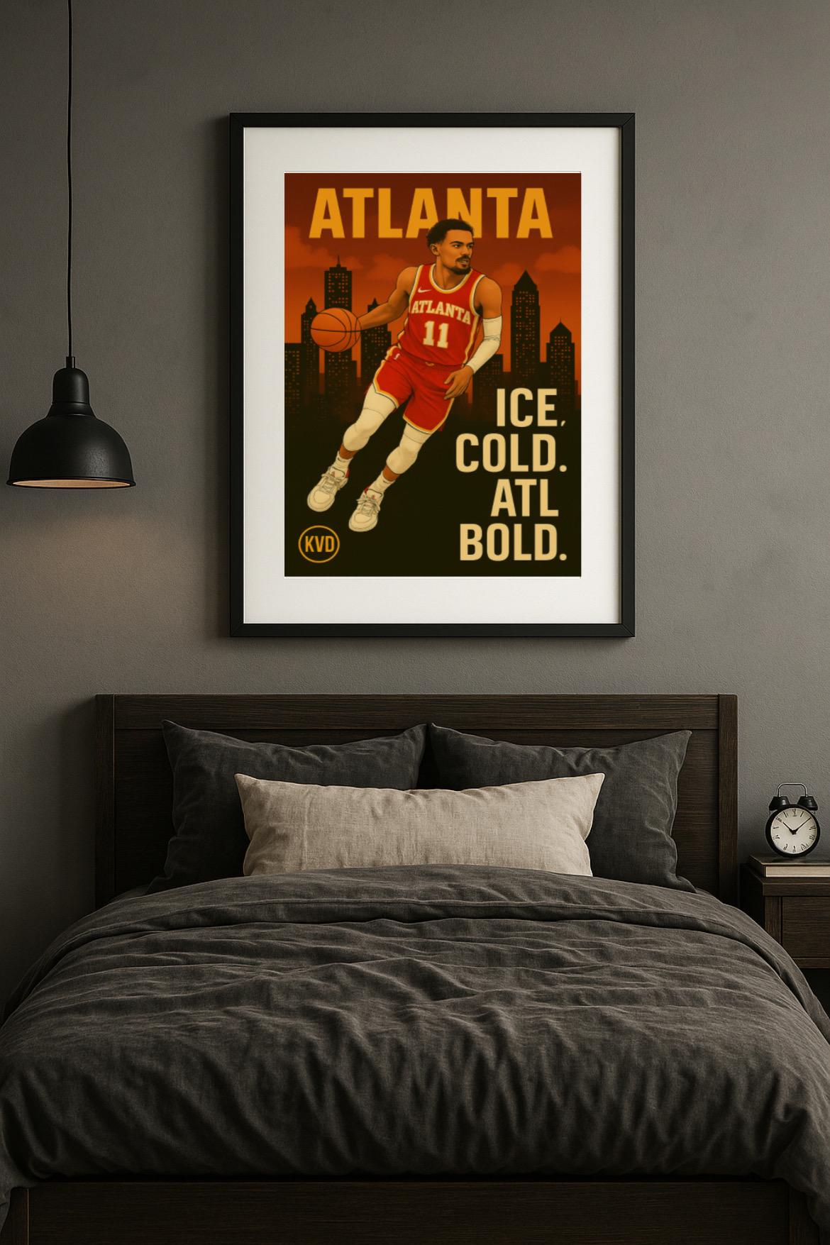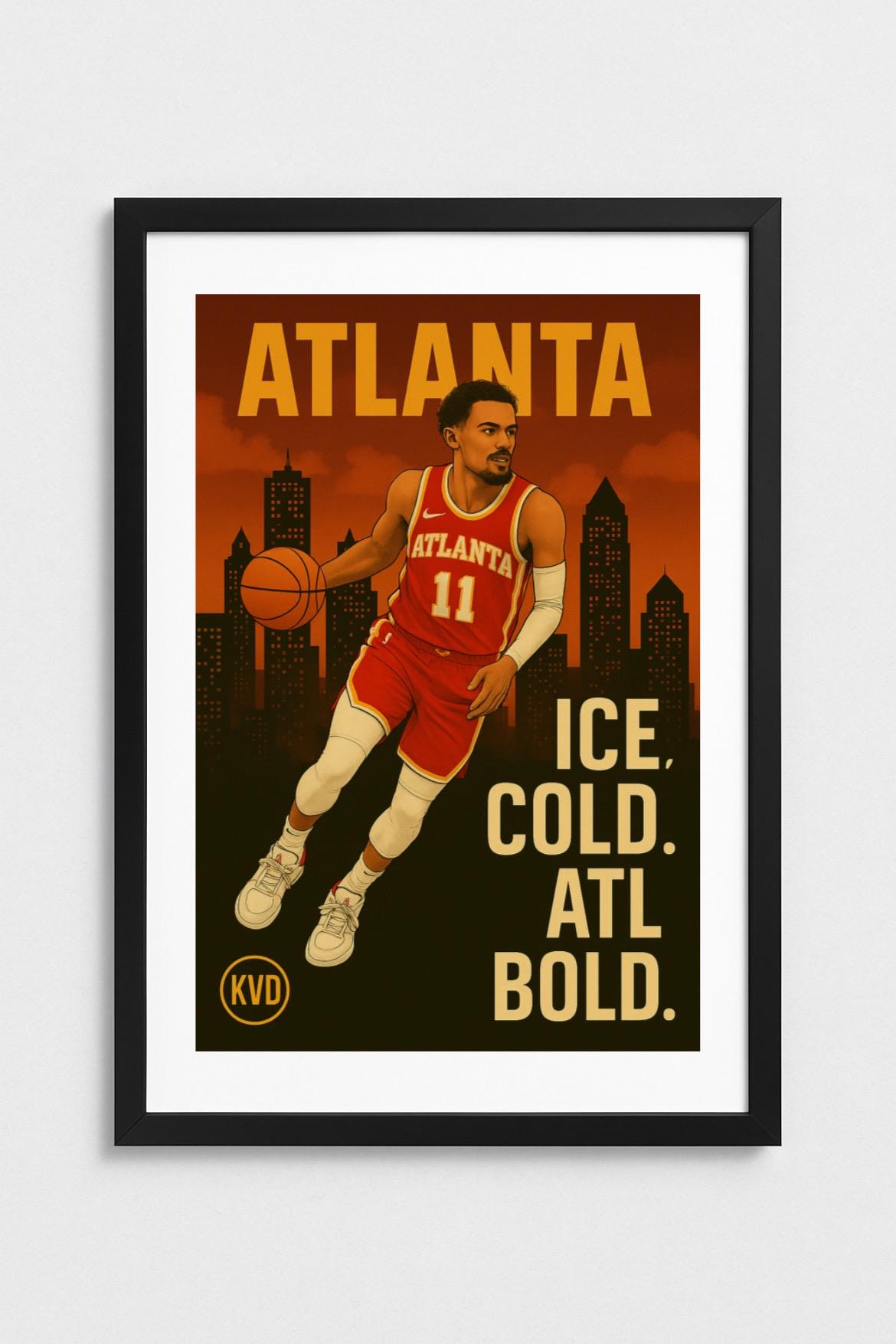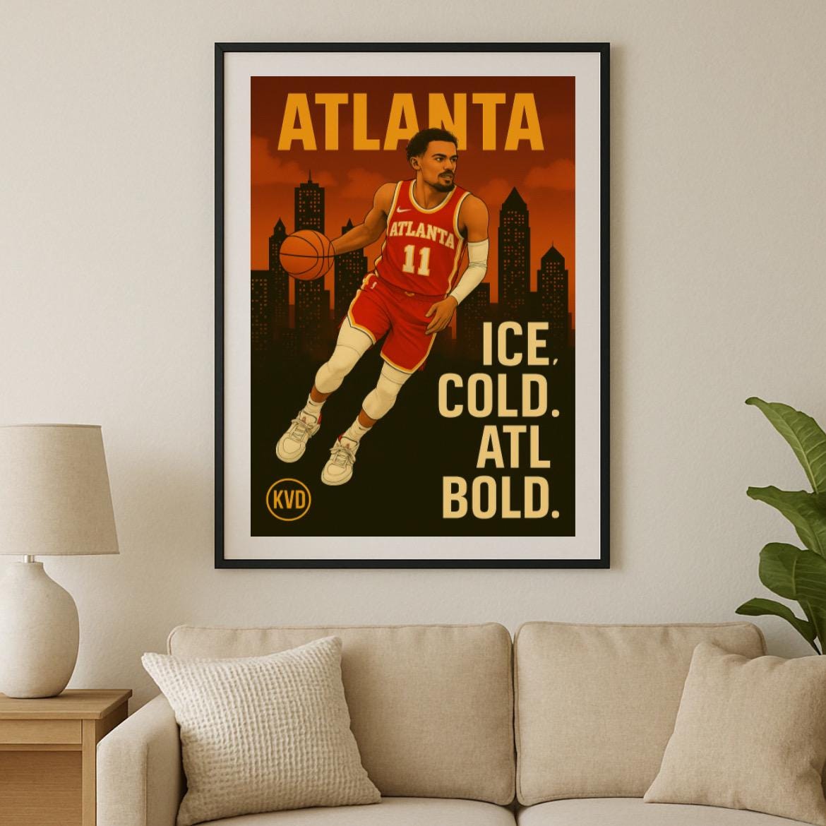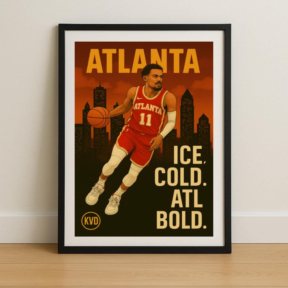 Bring your walls to life with this bold, illustrated poster featuring a basketball icon rising above the Atlanta skyline. Designed with illustrated realism and Southern swagger, this premium print captures Trae Young’s ice-cold handles, fearless shot-making, and bold leadership on Atlanta’s biggest stage.