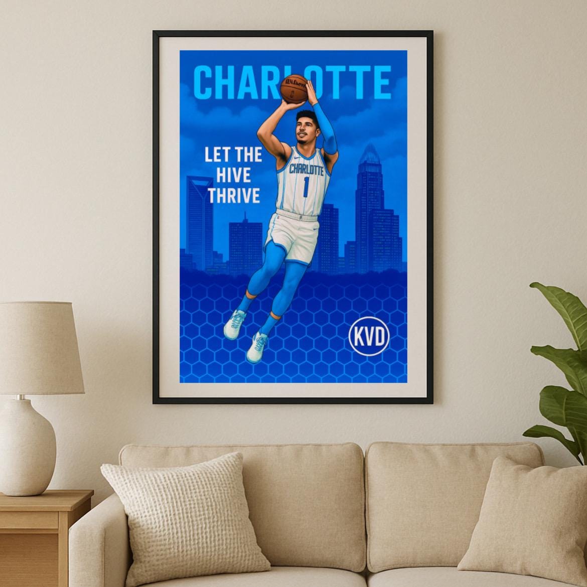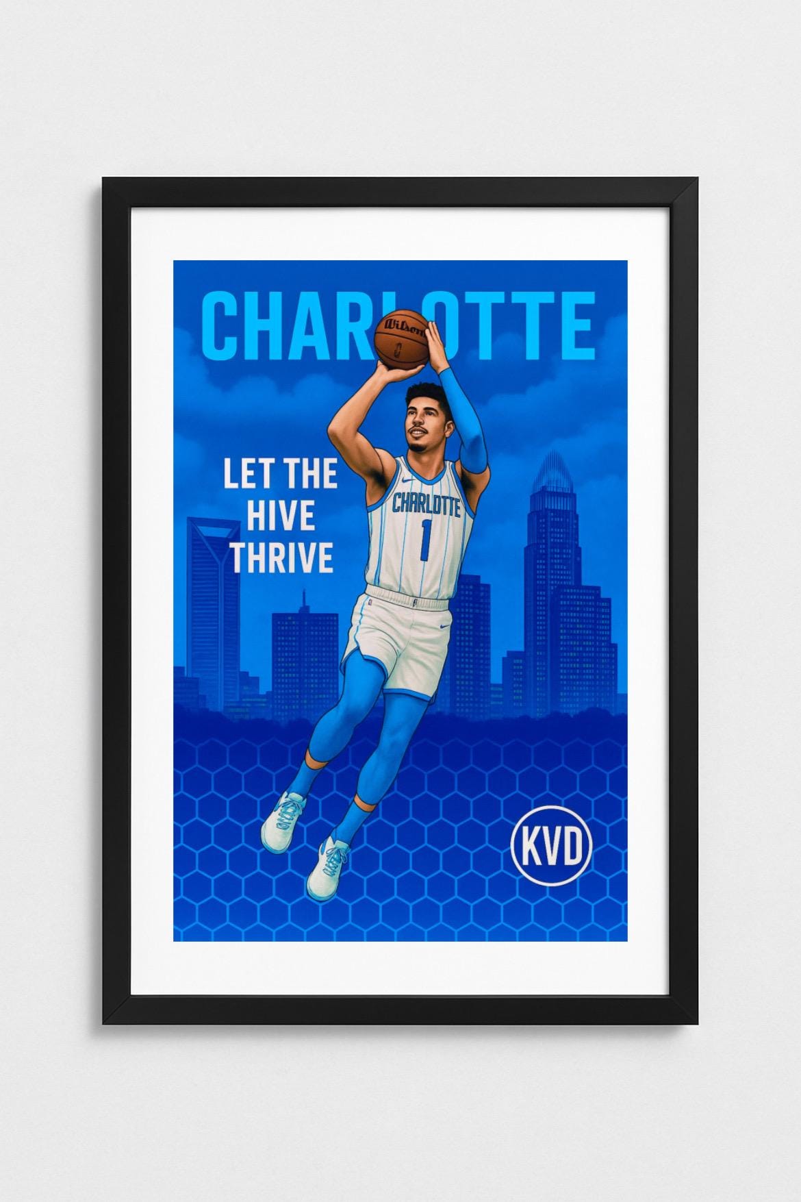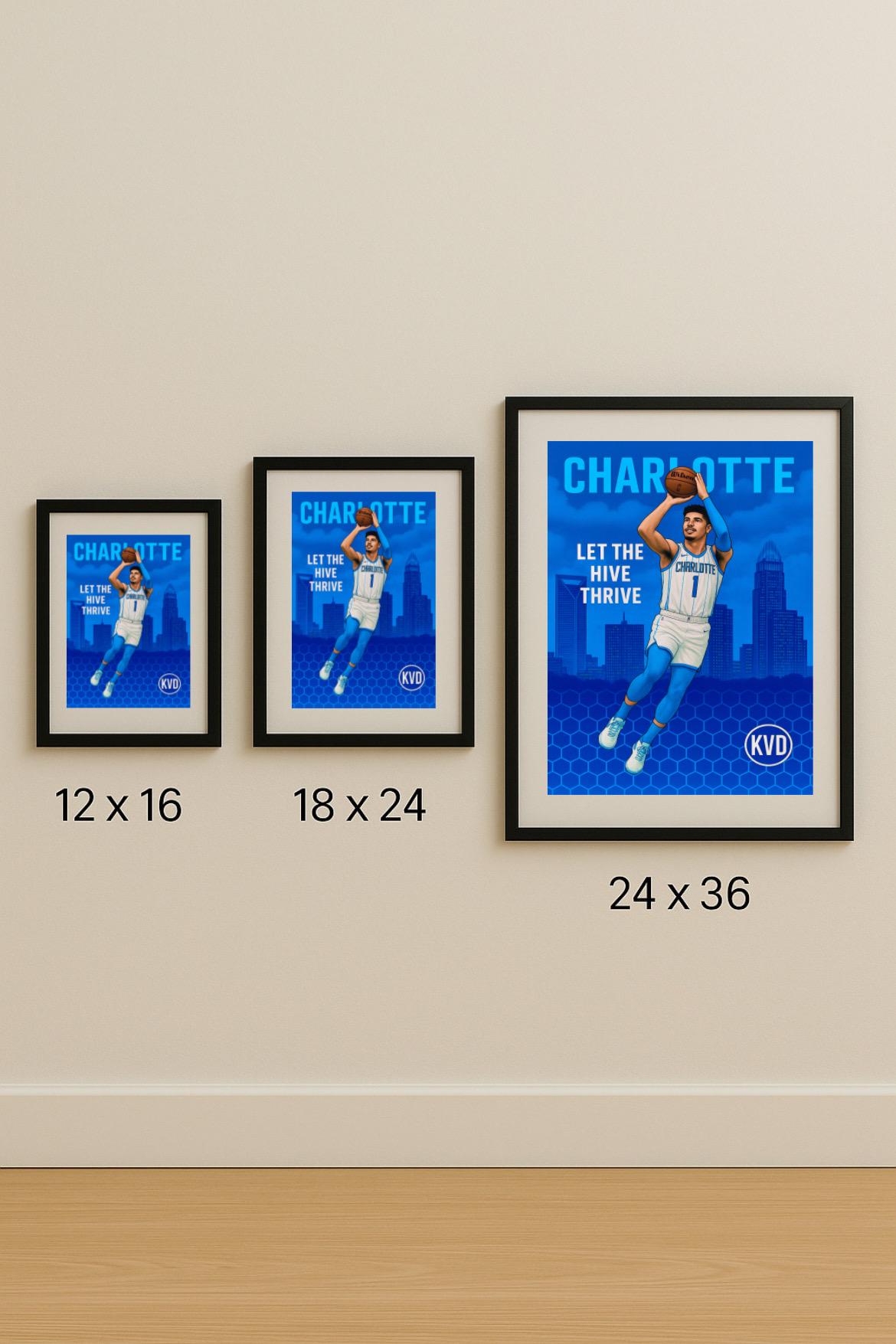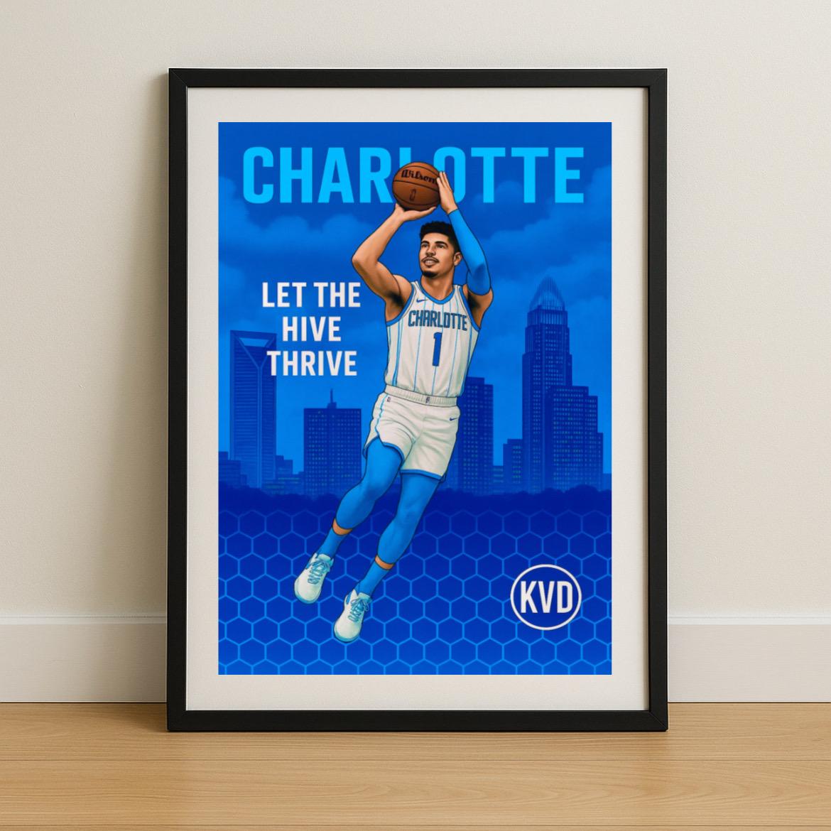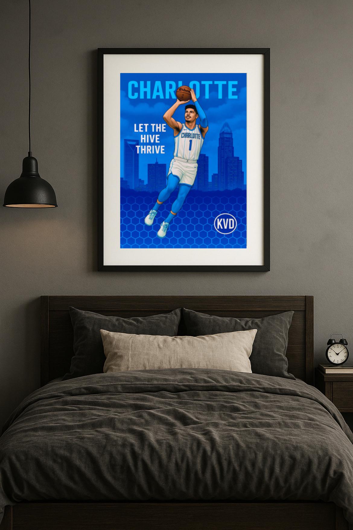 Bring your walls to life with this illustrated realism poster of LaMelo Ball soaring above the Charlotte skyline. Designed with vibrant Hornets colors and detailed city architecture, this piece captures Melo’s energy and the heart of Queen City hoops. Part of the KVD Skyline Collection — premium prints for true fans.