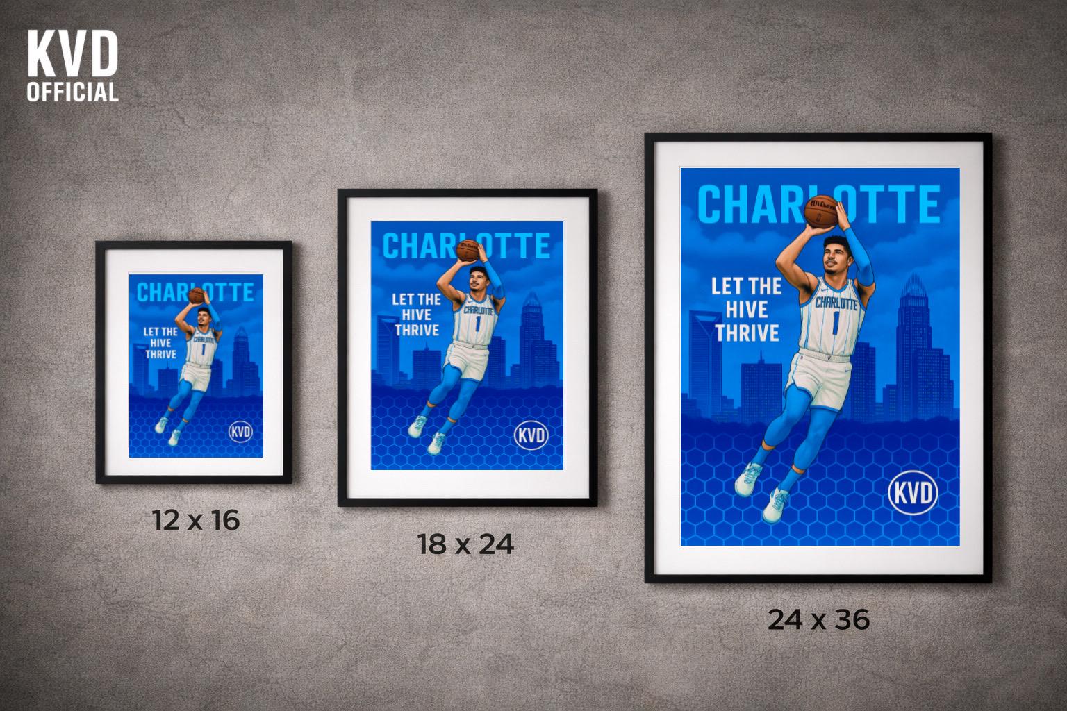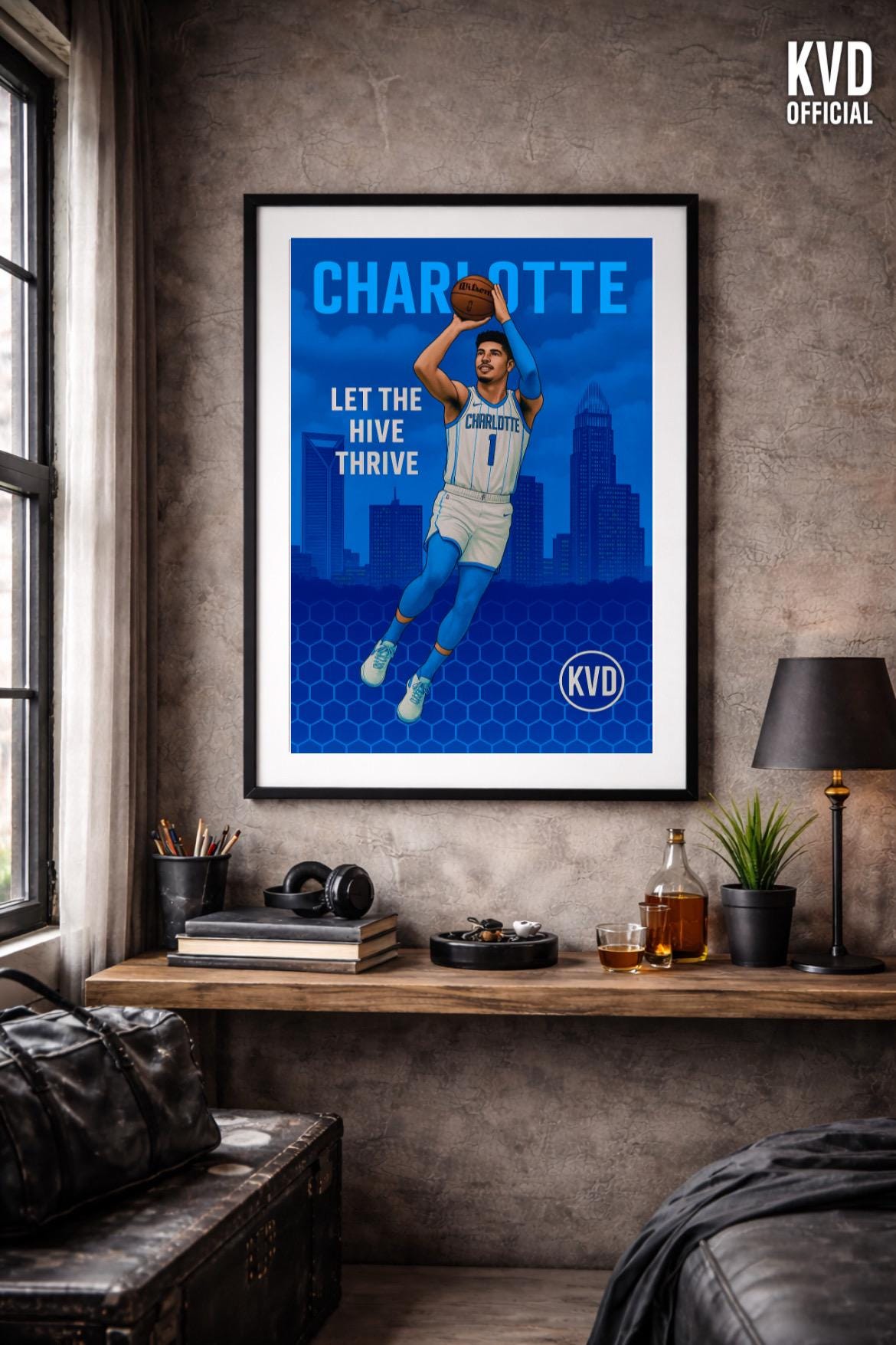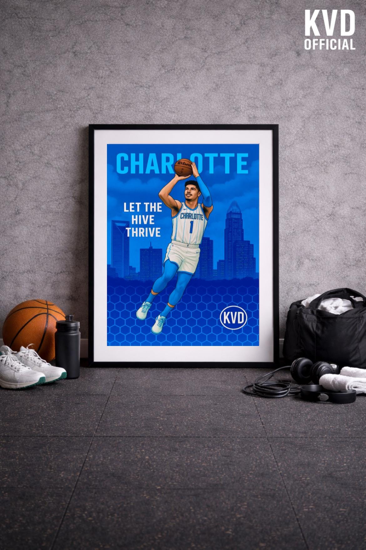 Bring your walls to life with this illustrated realism poster of LaMelo Ball soaring above the Charlotte skyline. Designed with vibrant Hornets colors and detailed city architecture, this piece captures Melo’s energy and the heart of Queen City hoops. Part of the KVD Skyline Collection — premium prints for true fans.