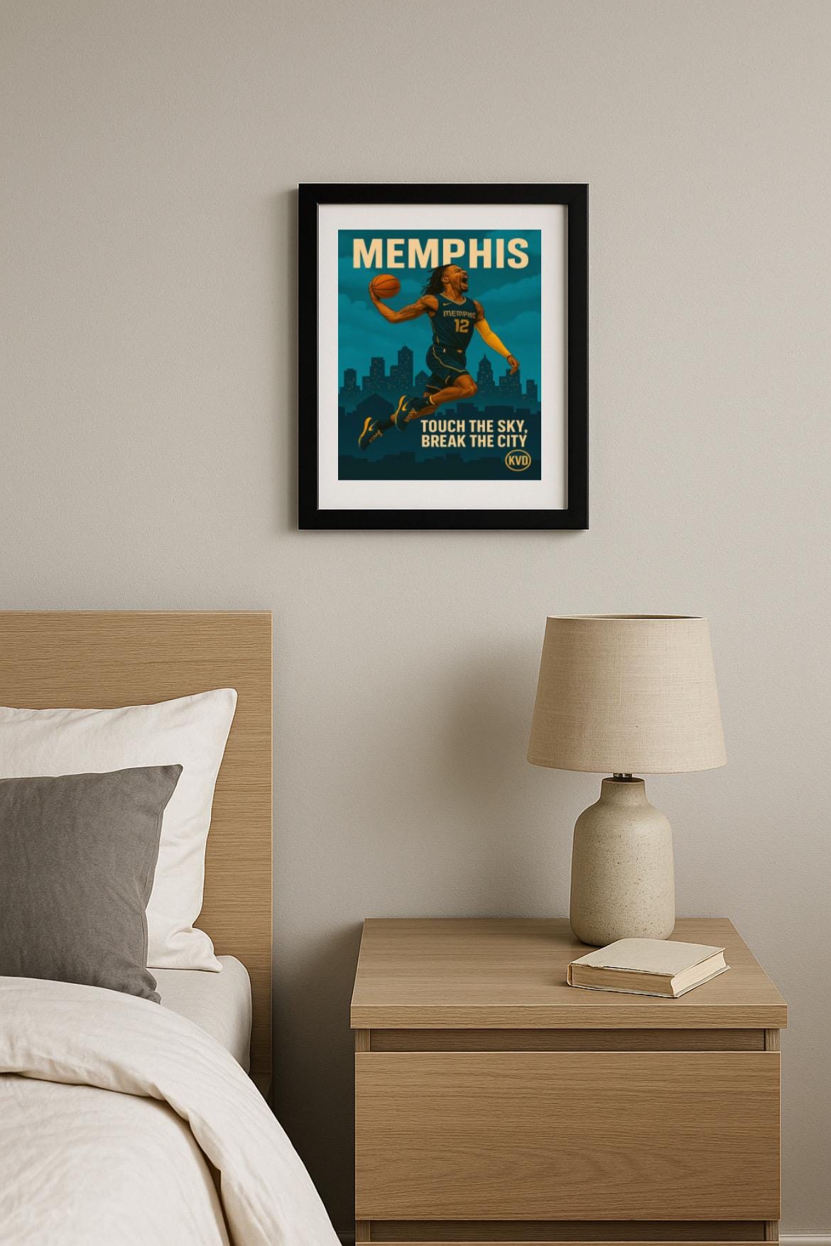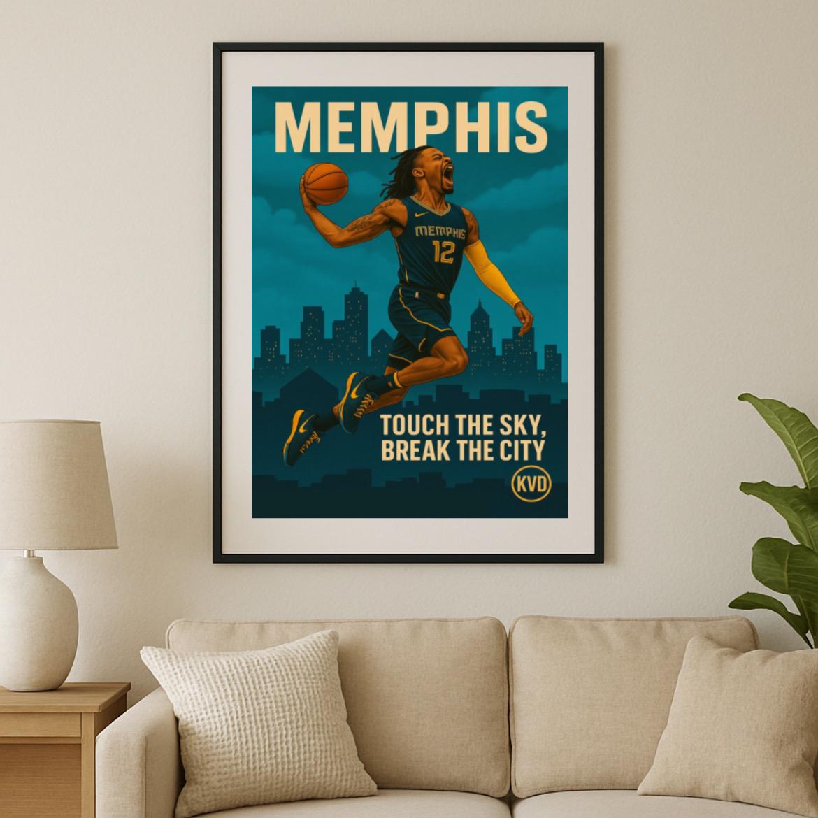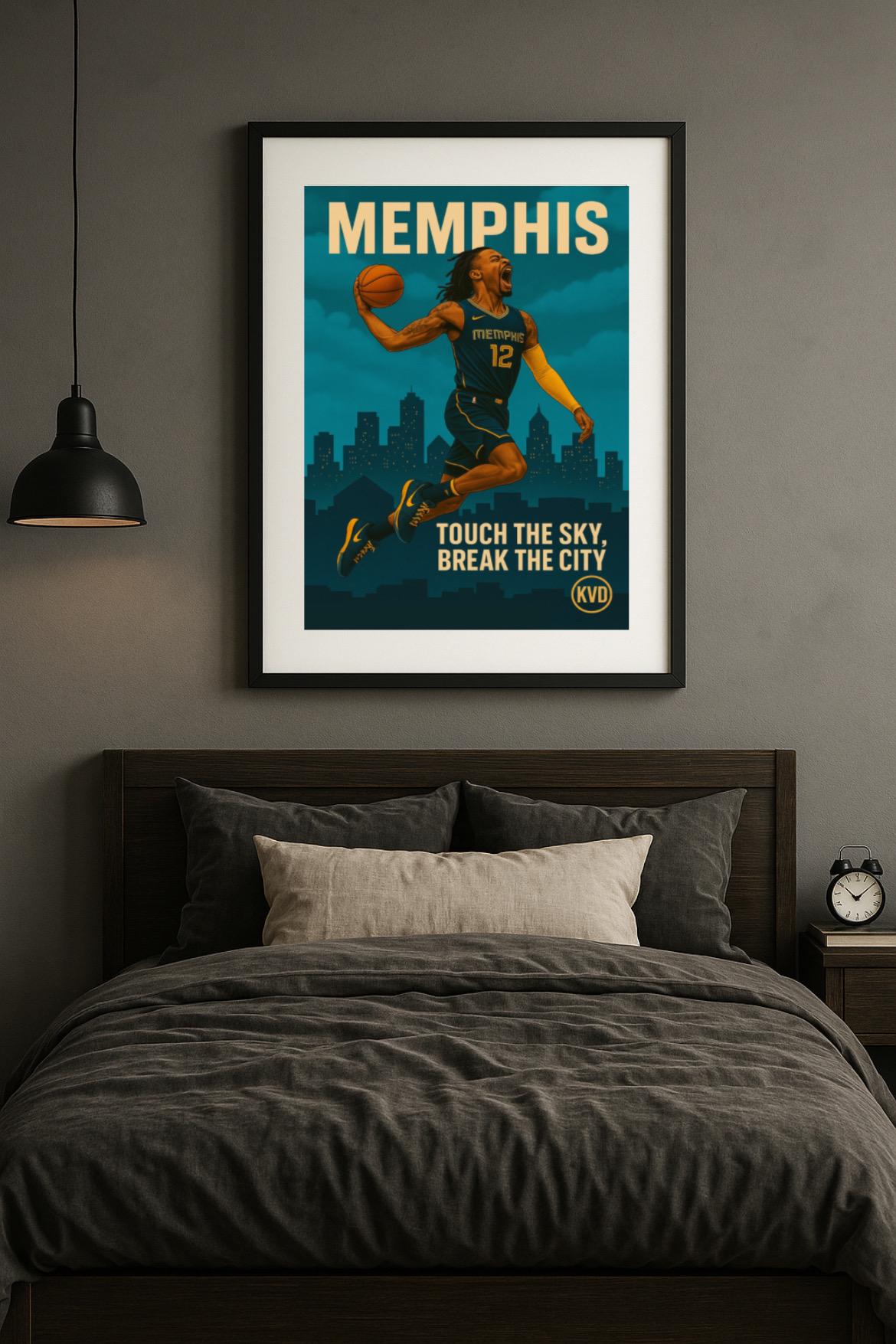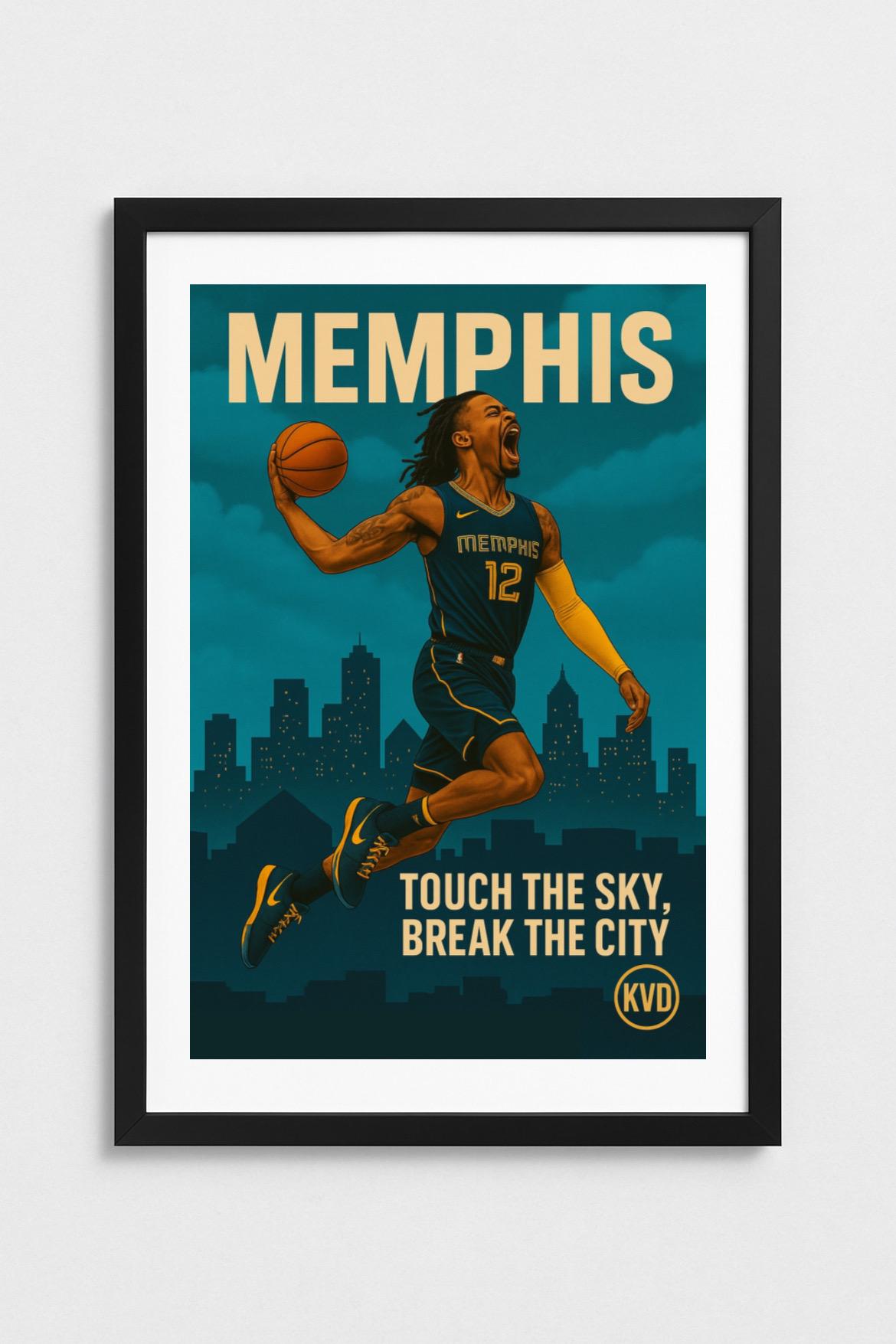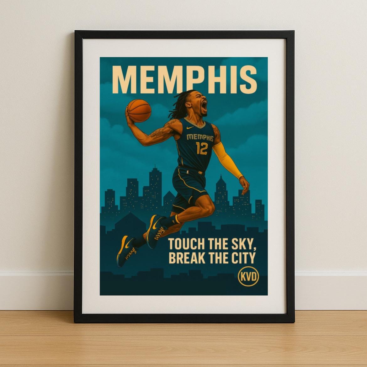 Bring Memphis energy to your space with this explosive Skyline Collection poster featuring Ja Morant in mid-air over the city skyline. Styled in deep teal and gold with illustrated realism, this design captures Ja’s elevation and the intensity of MEM basketball. A bold tribute to the grind and greatness of the Bluff City.