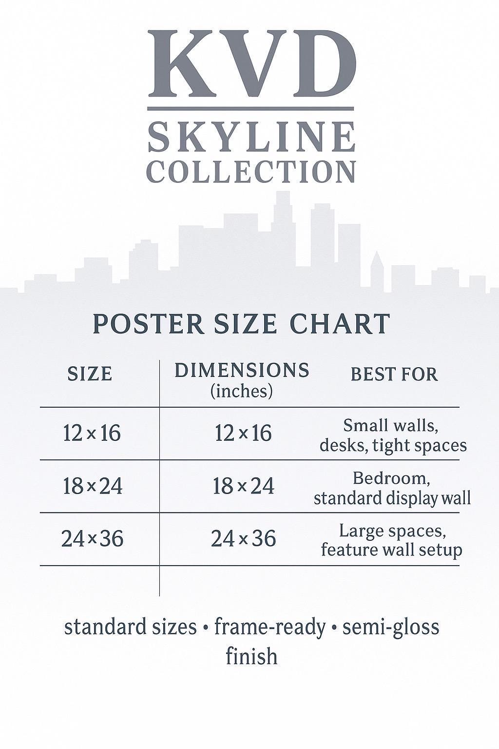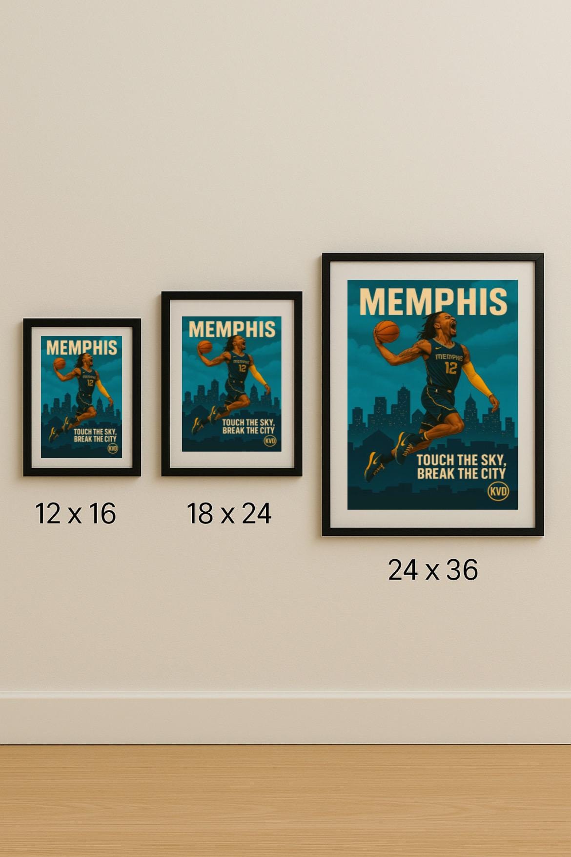 Details: 💥 Slogan: TOUCH THE SKY, BREAK THE CITY 🏙️ City: Memphis (MEM) 🎨 Style: Illustrated realism with bold skyline design 📐 Sizes: 12×16”, 18×24”, 24×36” 🖨️ Finish: Semi-gloss poster paper (unframed) 🎨 Artwork: Original by KVD