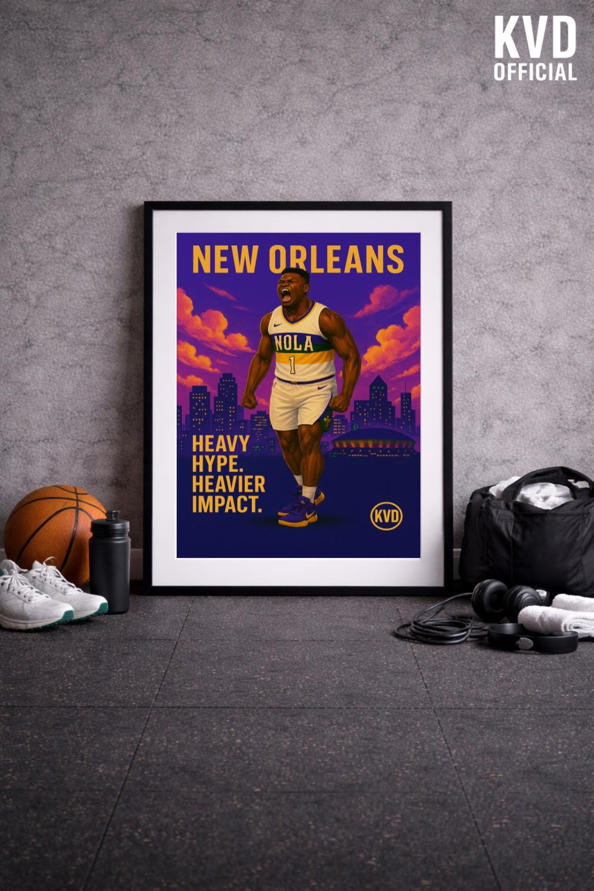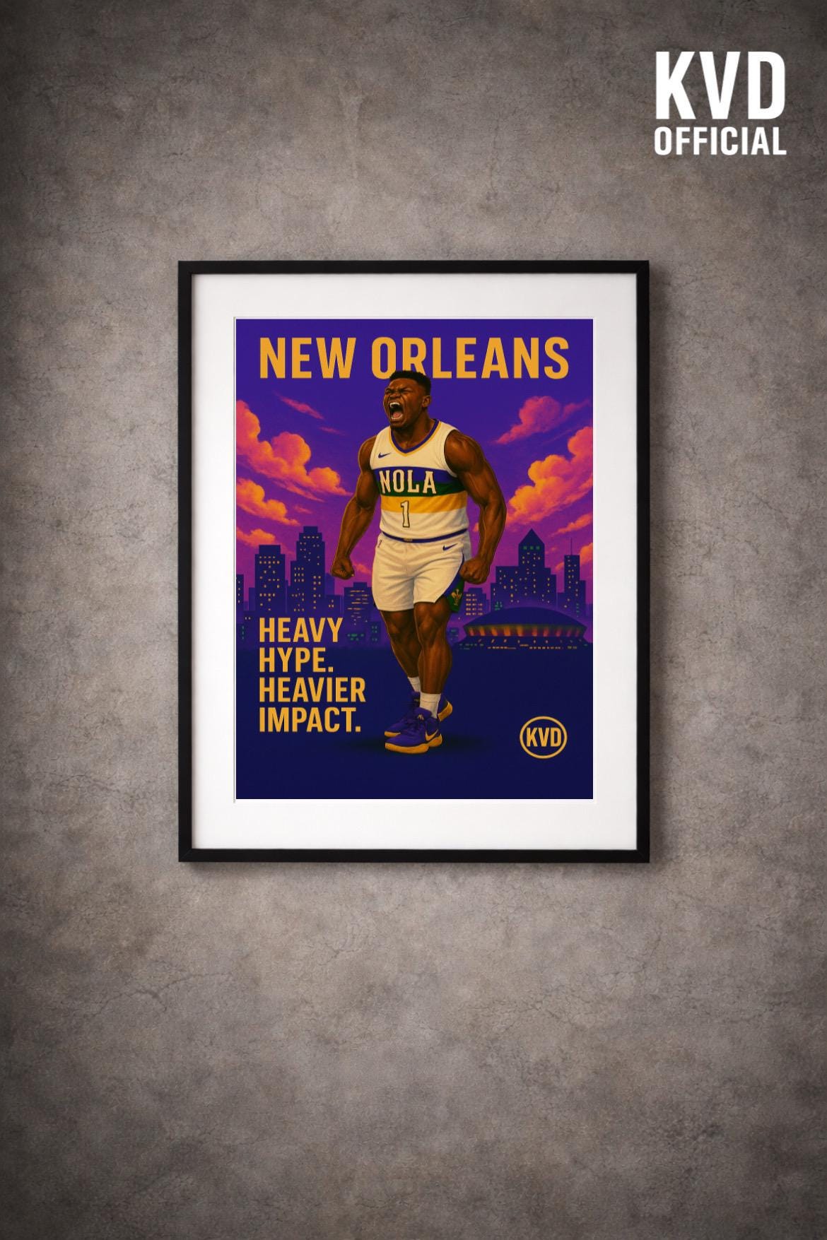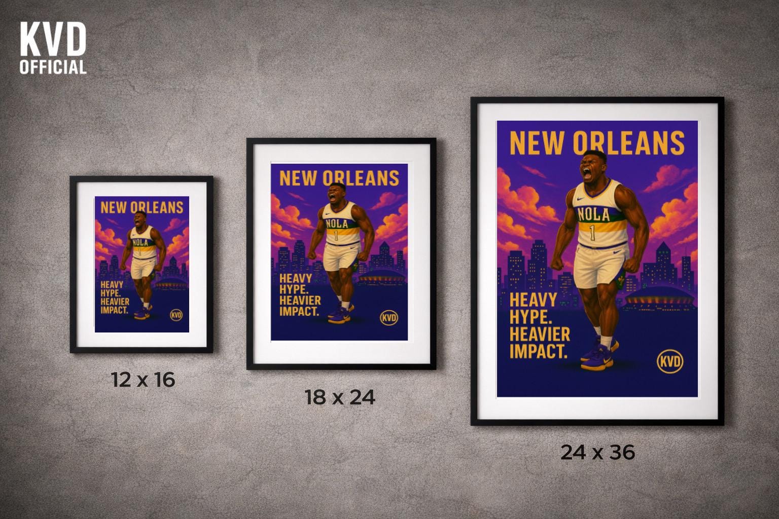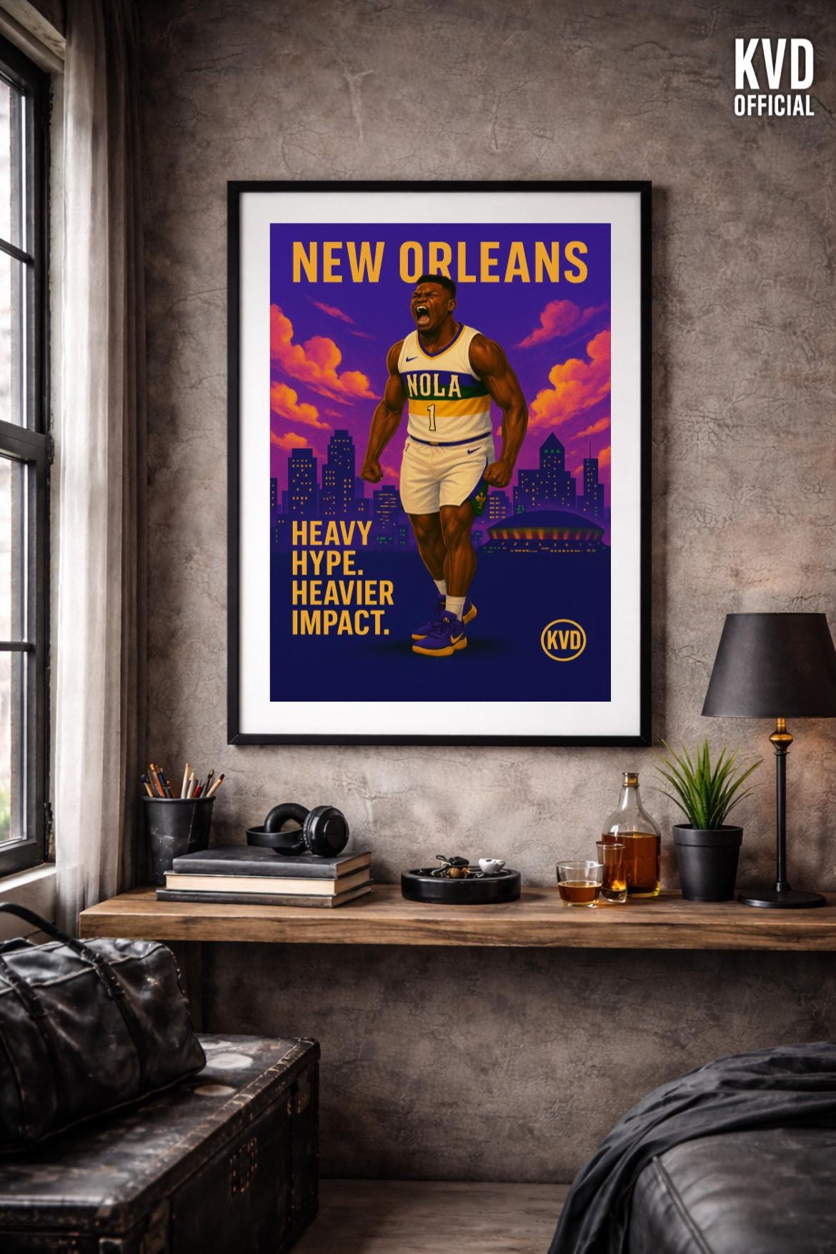 Big body, big statement. This Skyline Collection poster captures Zion Williamson’s power and presence over the New Orleans skyline in full illustrated realism. Drenched in purple, gold, and sunset tones, this design brings the weight of expectation — and the force of delivery — to your wall.