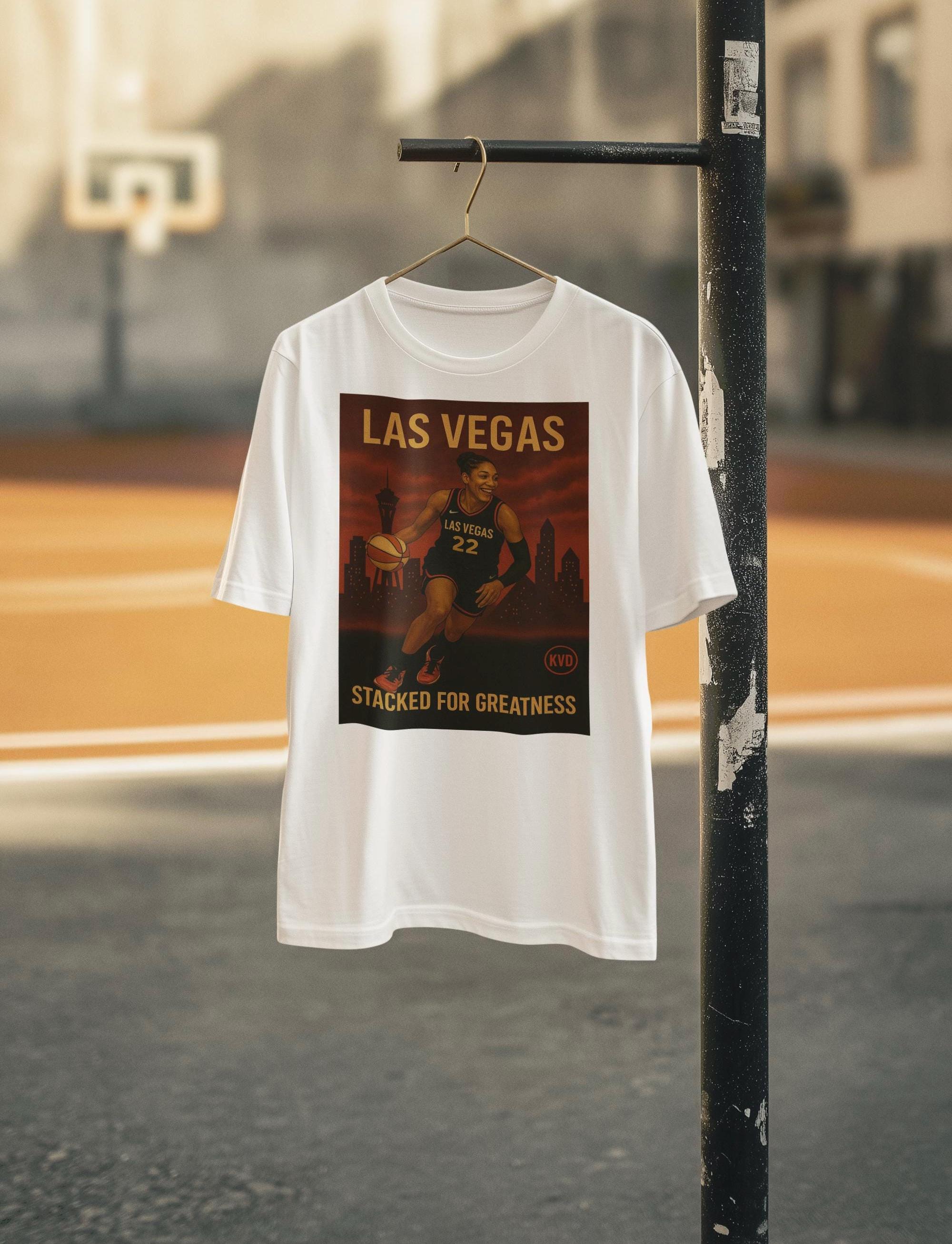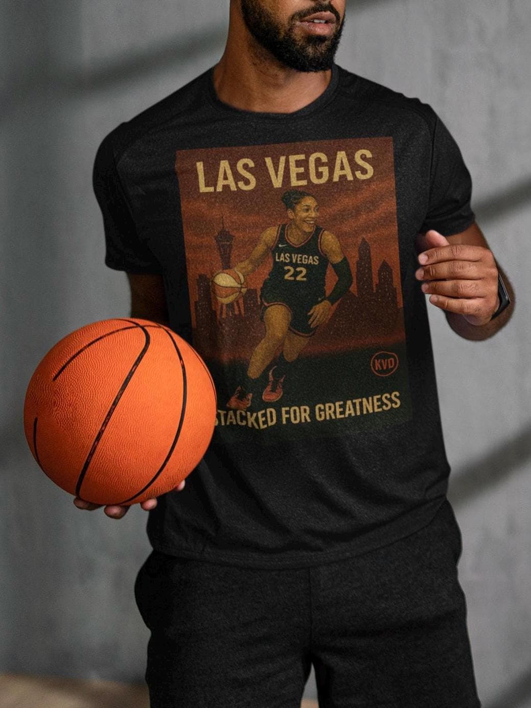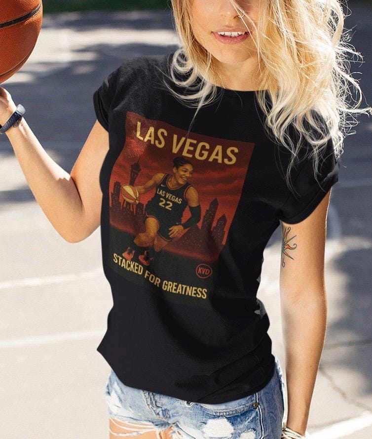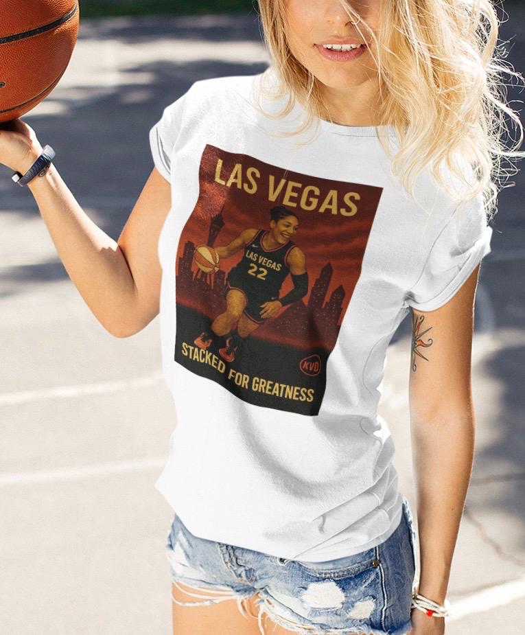 Carry the energy of a champion. This premium tee features A’ja Wilson rising over the Las Vegas skyline in bold illustrated detail — part of the KVD Skyline Collection: Women’s Hoops Edition. _