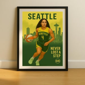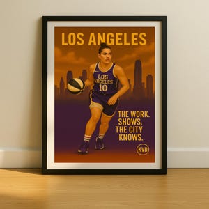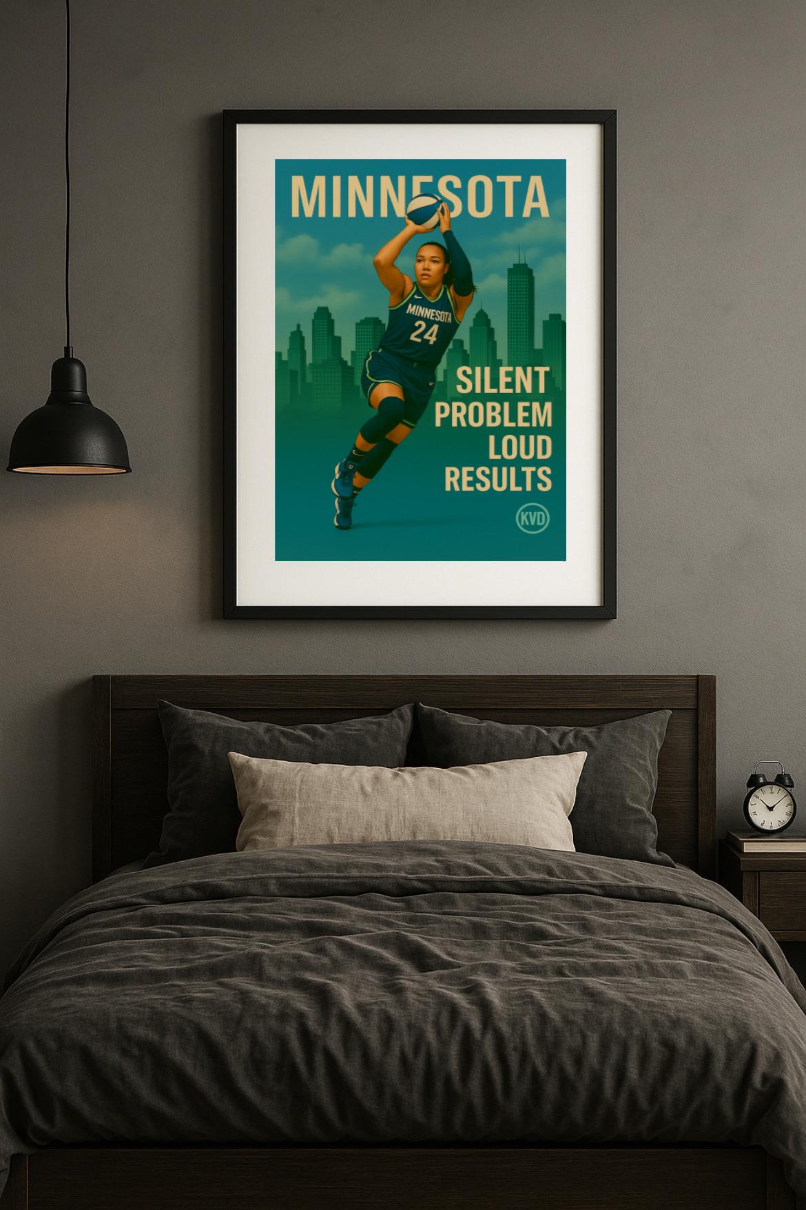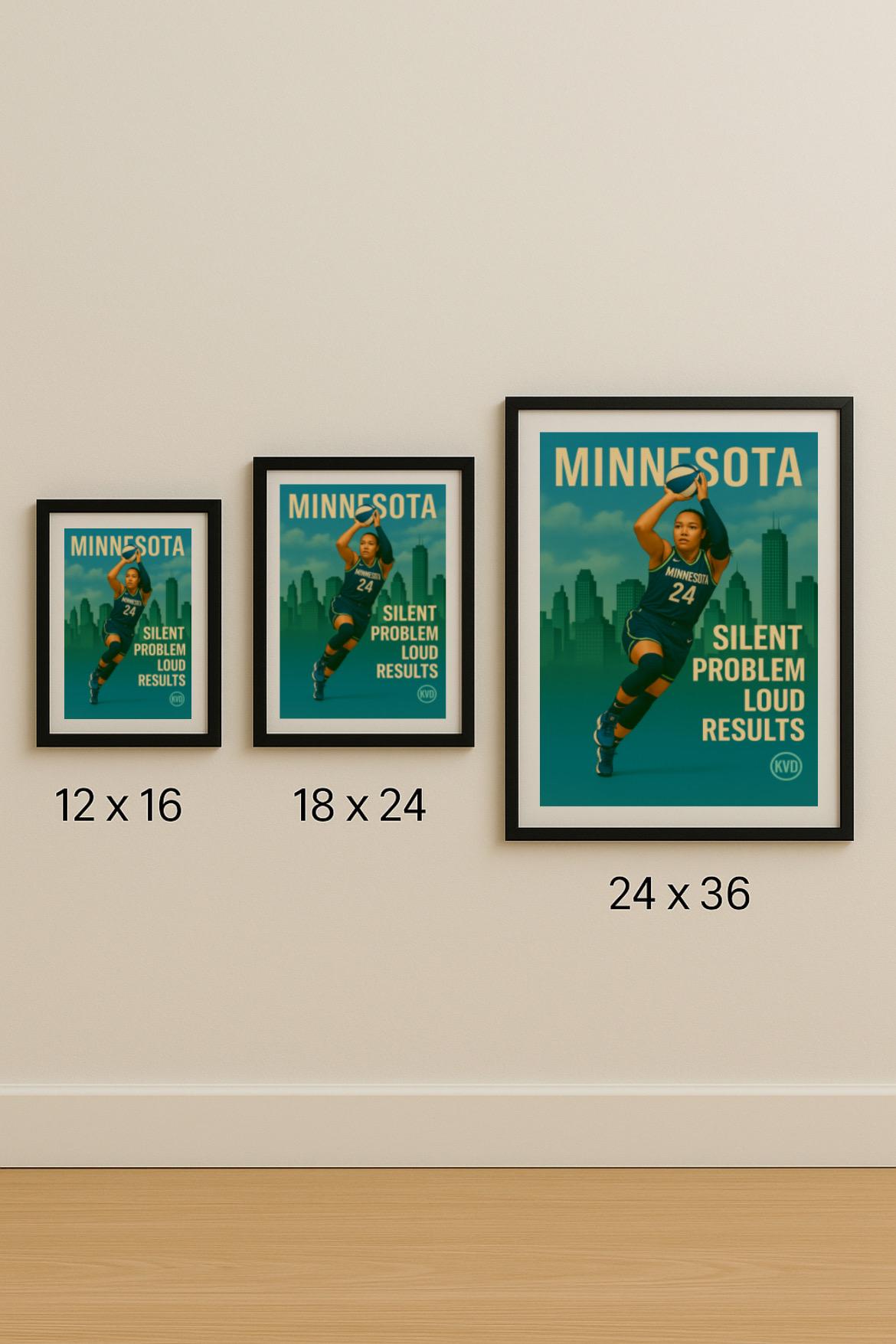 Bring your walls to life with this bold, illustrated poster featuring Napheesa Collier over the Minnesota skyline. Part of the KVD Skyline Collection – Women’s Hoops Edition, this design blends calm intensity with illustrated realism, capturing the silent presence of one of the most efficient two-way players in the game.