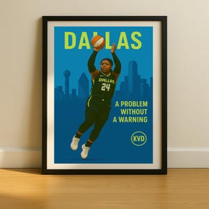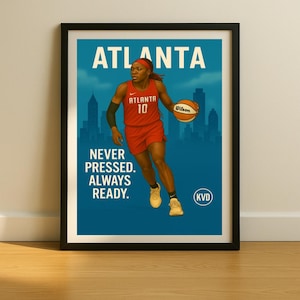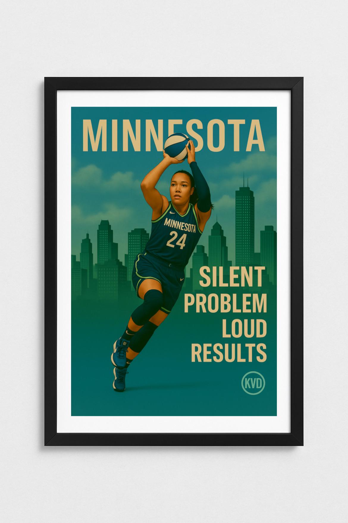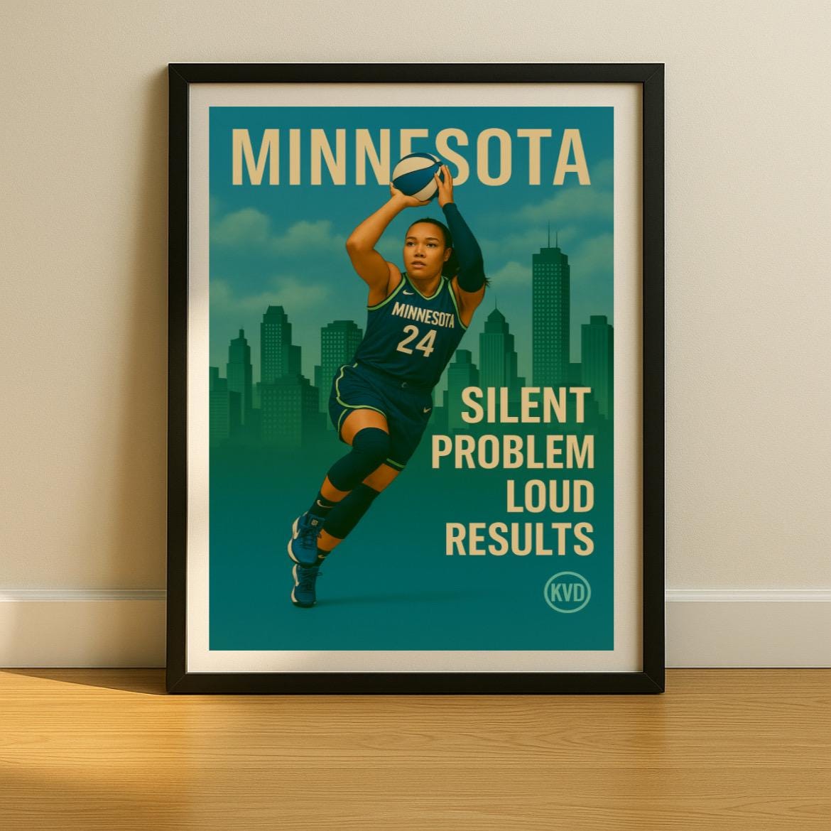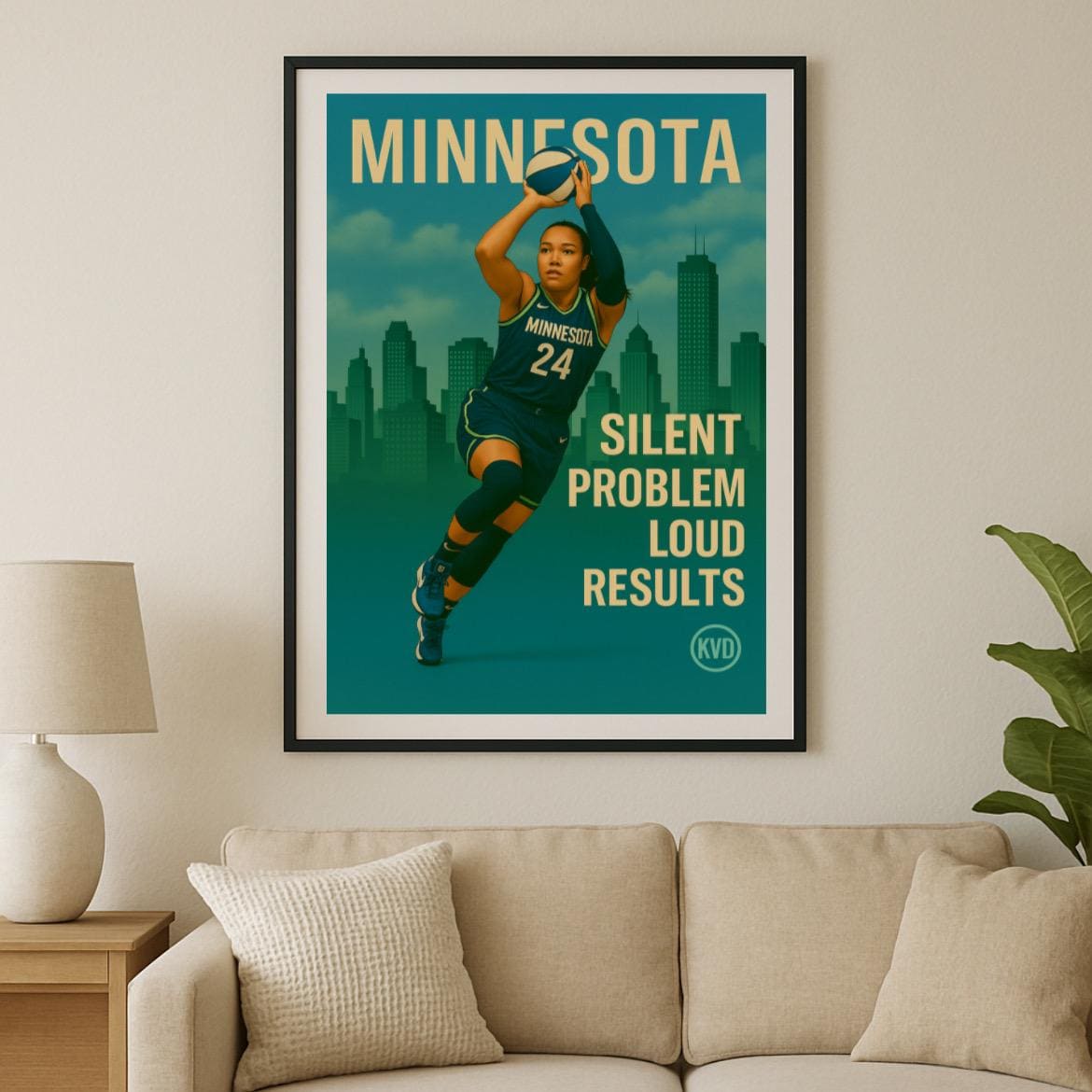 Bring your walls to life with this bold, illustrated poster featuring Napheesa Collier over the Minnesota skyline. Part of the KVD Skyline Collection – Women’s Hoops Edition, this design blends calm intensity with illustrated realism, capturing the silent presence of one of the most efficient two-way players in the game.