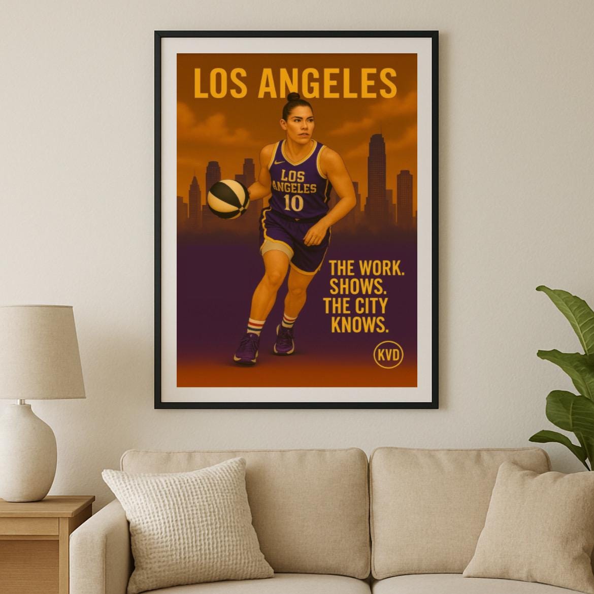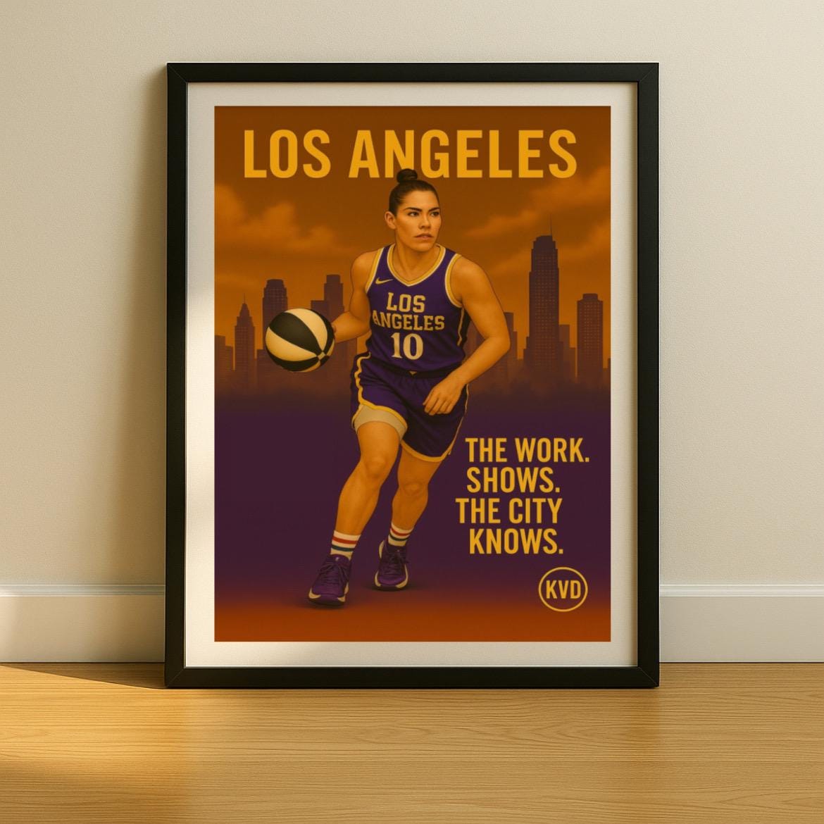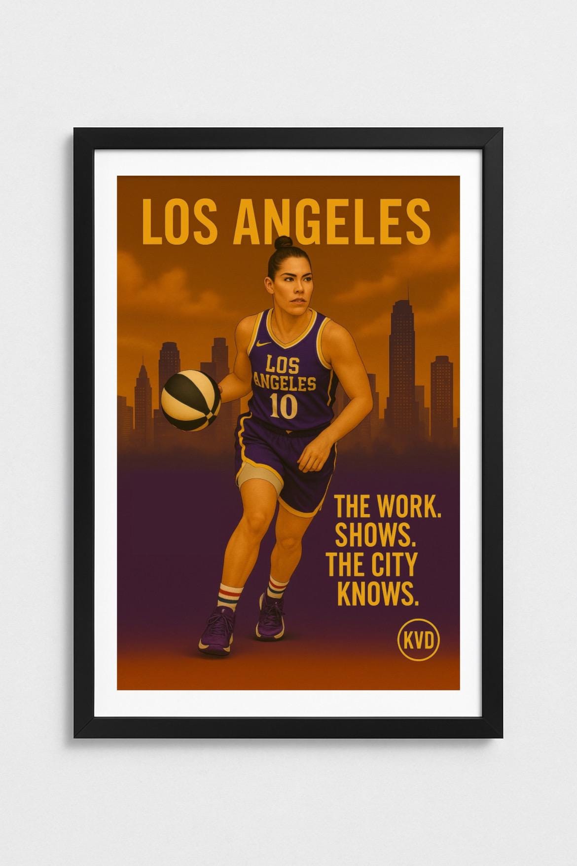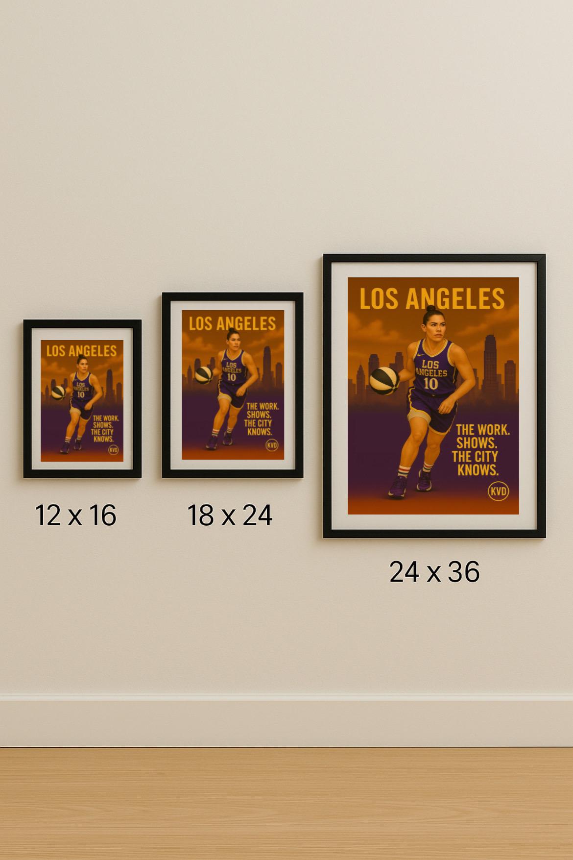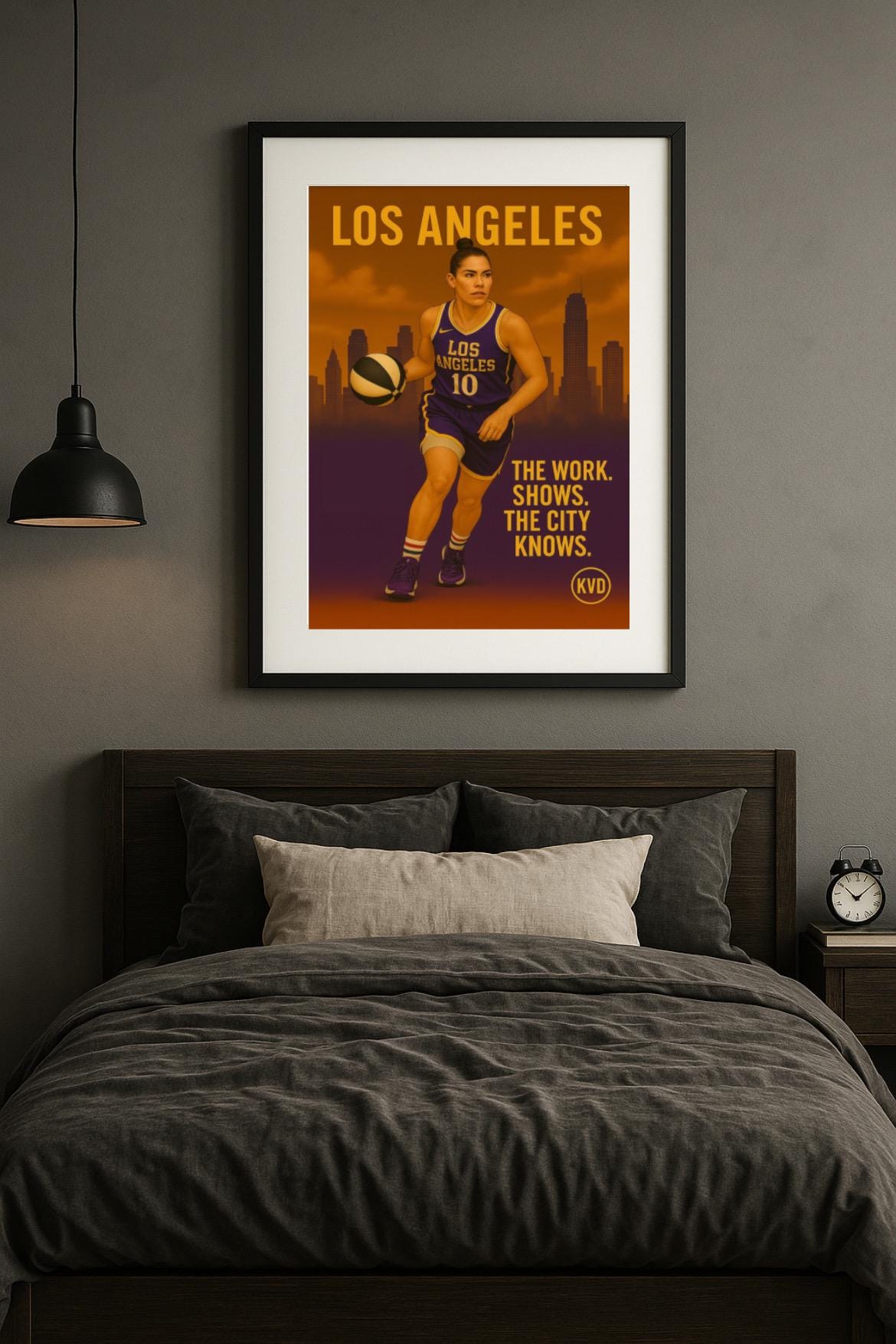Bring your walls to life with this bold, illustrated poster featuring Kelsey Plum rising above the Los Angeles skyline. Designed with illustrated realism and city pride, this premium print captures Plum’s edge, grit, and leadership on the court. —