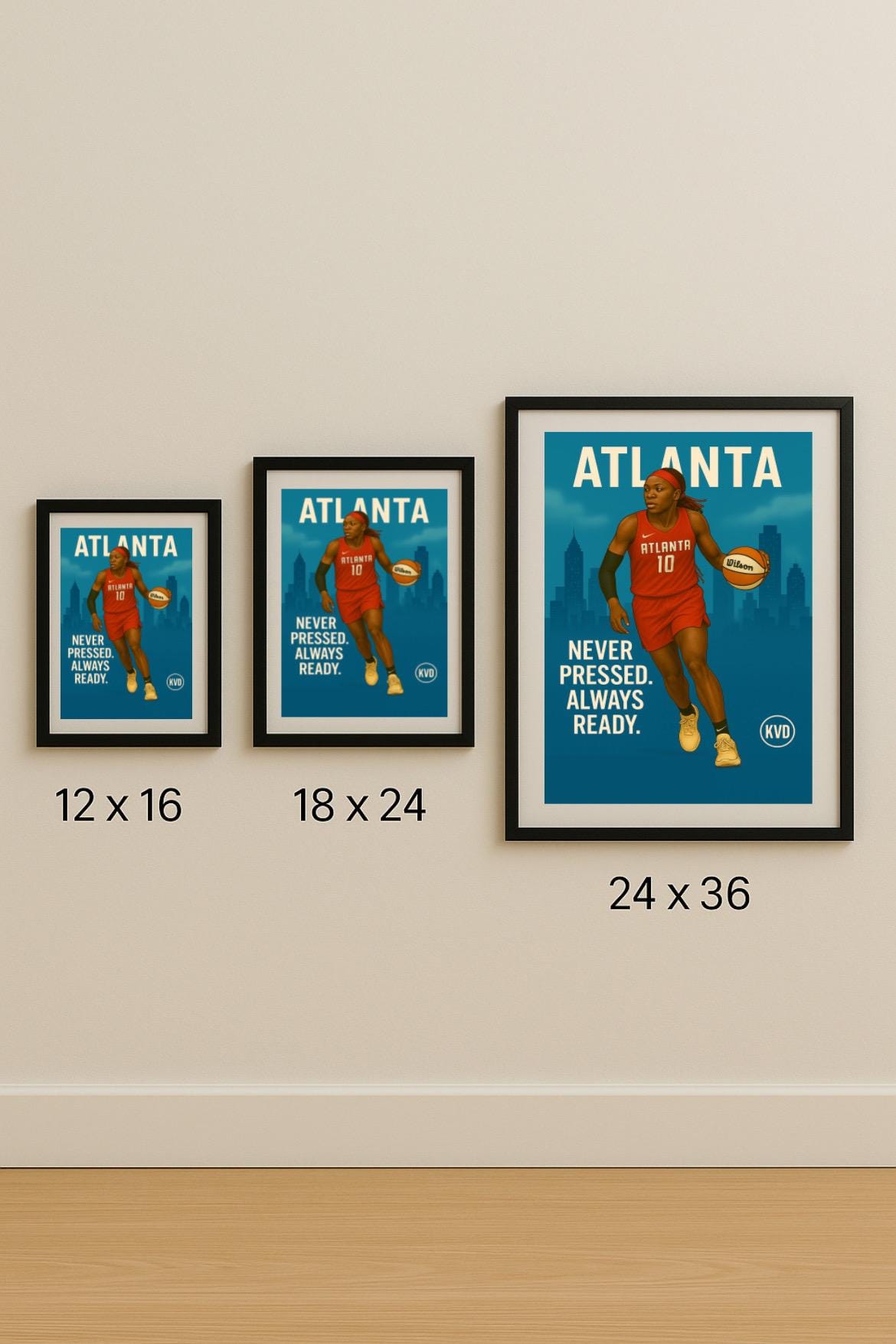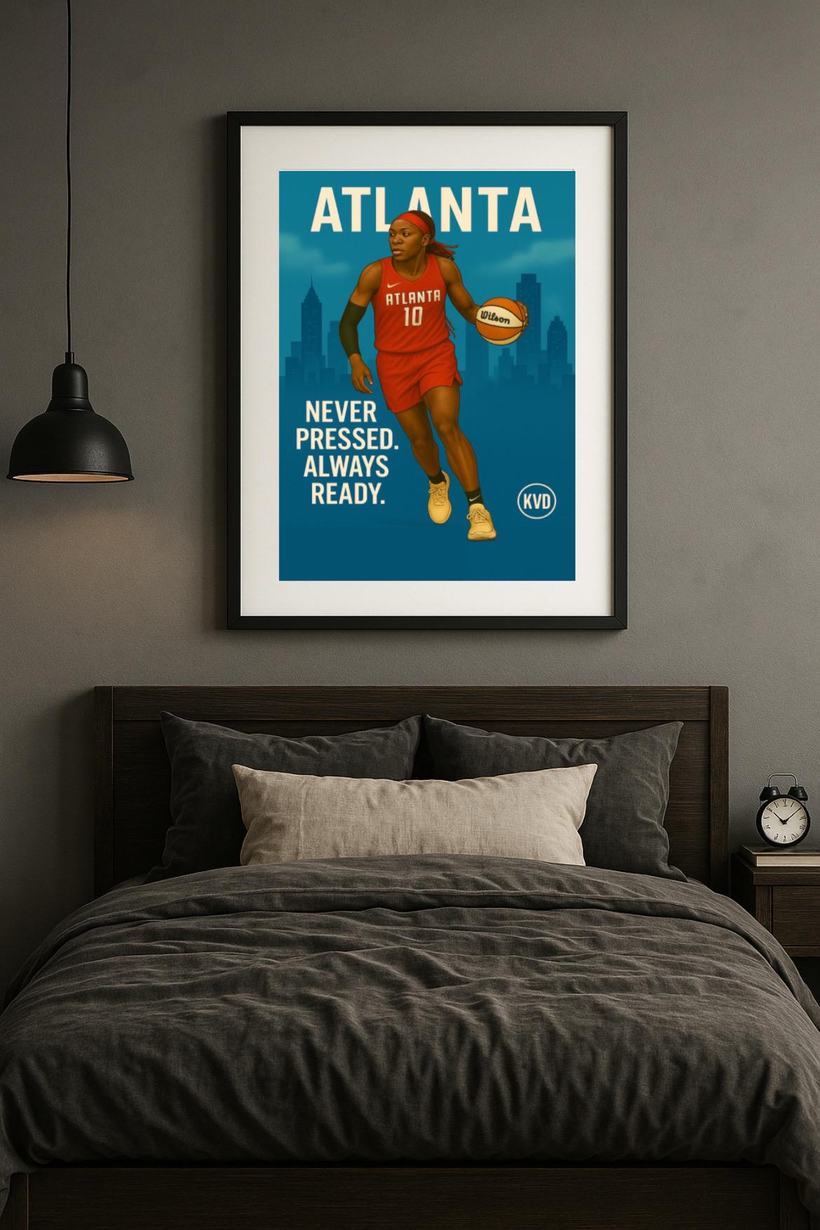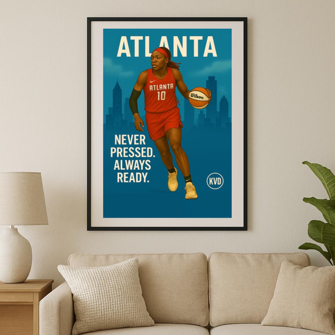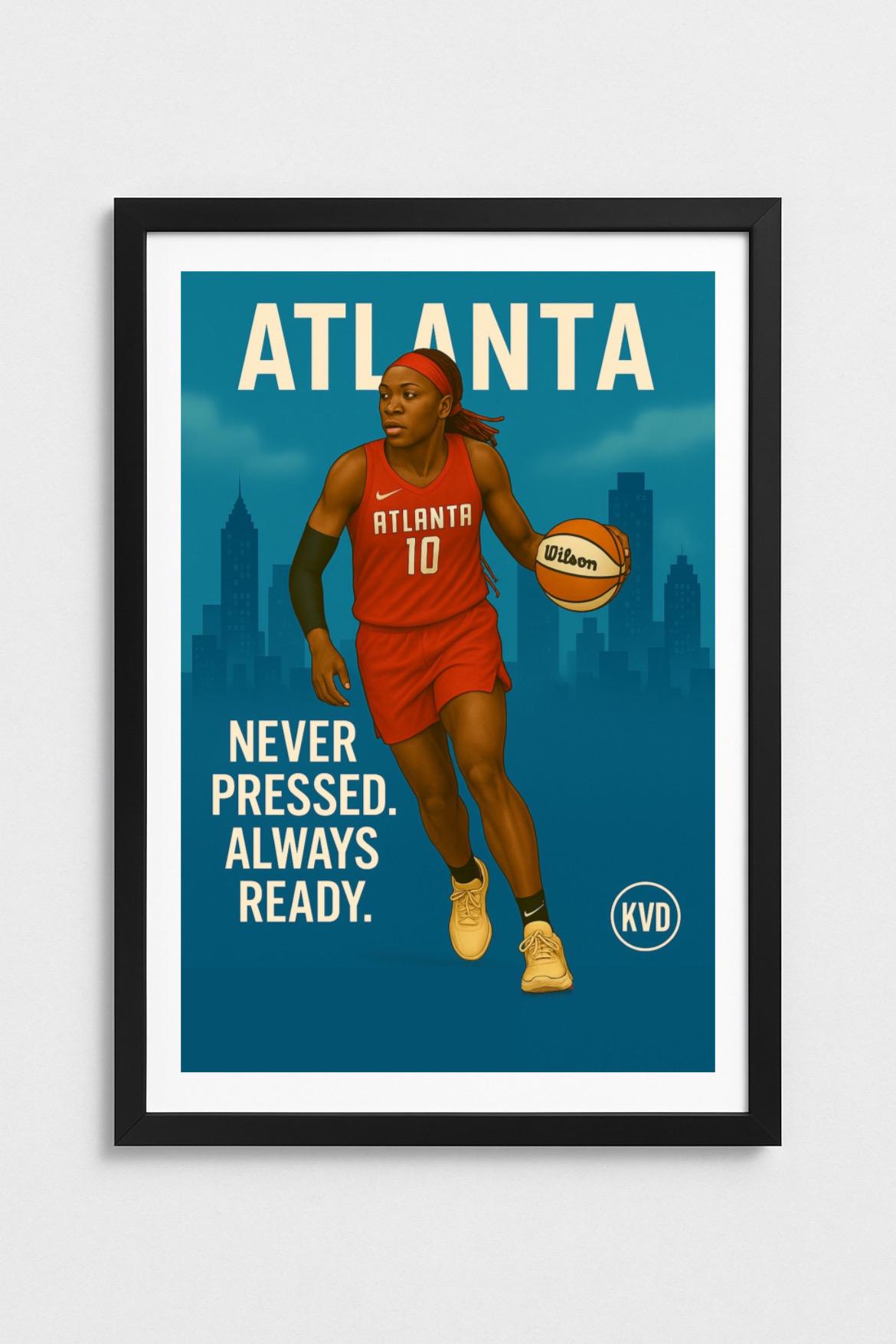 Atlanta’s game runs through her — and she makes it look easy. This bold, illustrated design features Rhyne Howard in full form, captured mid-stride in front of the Atlanta skyline.