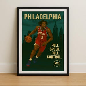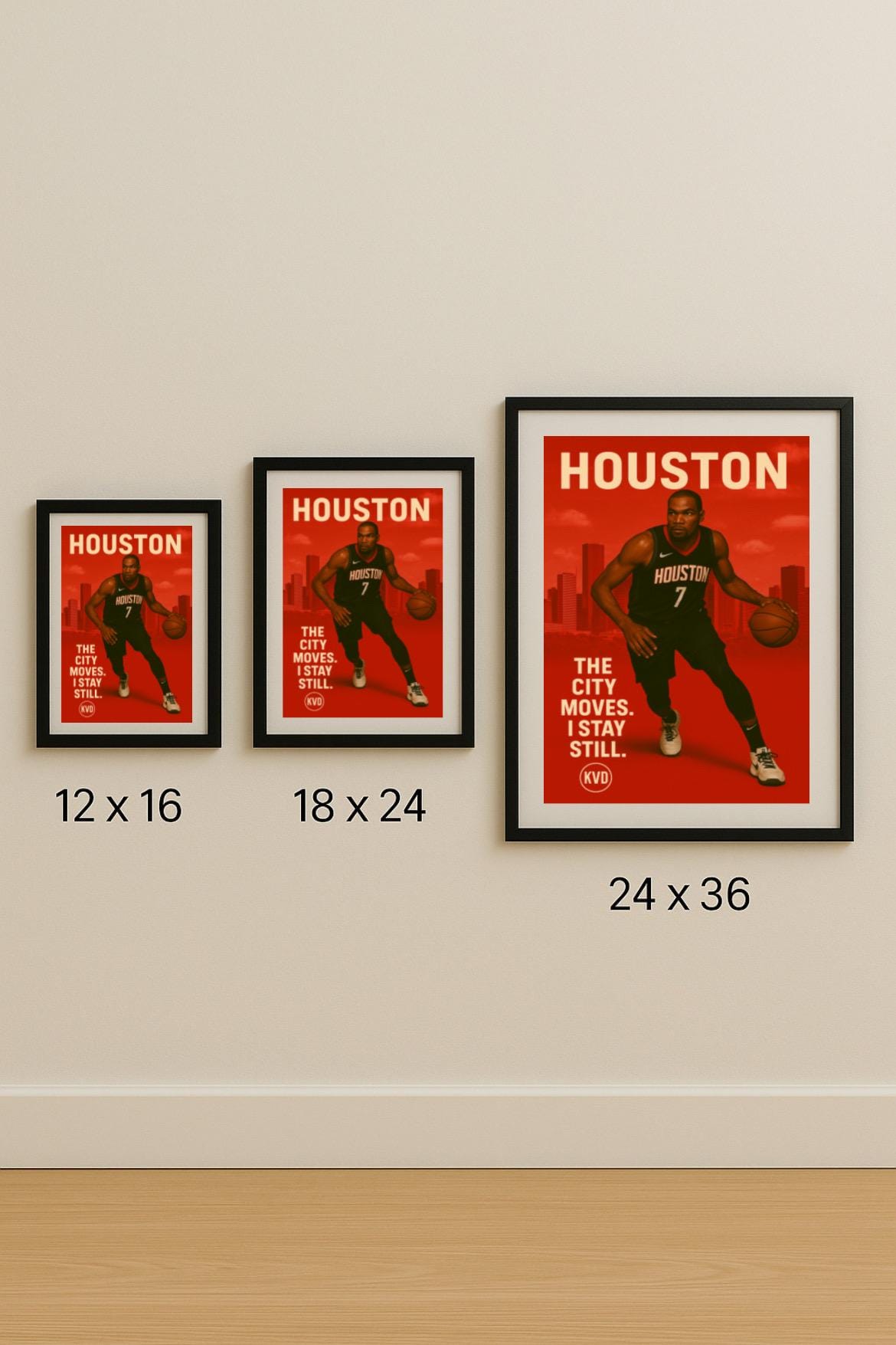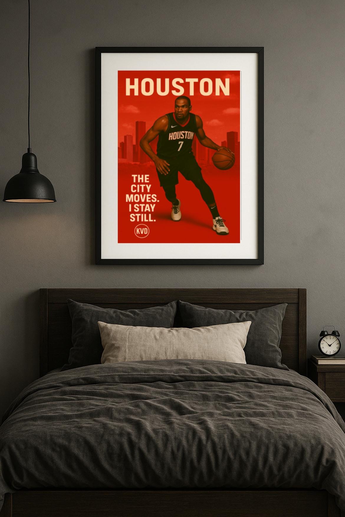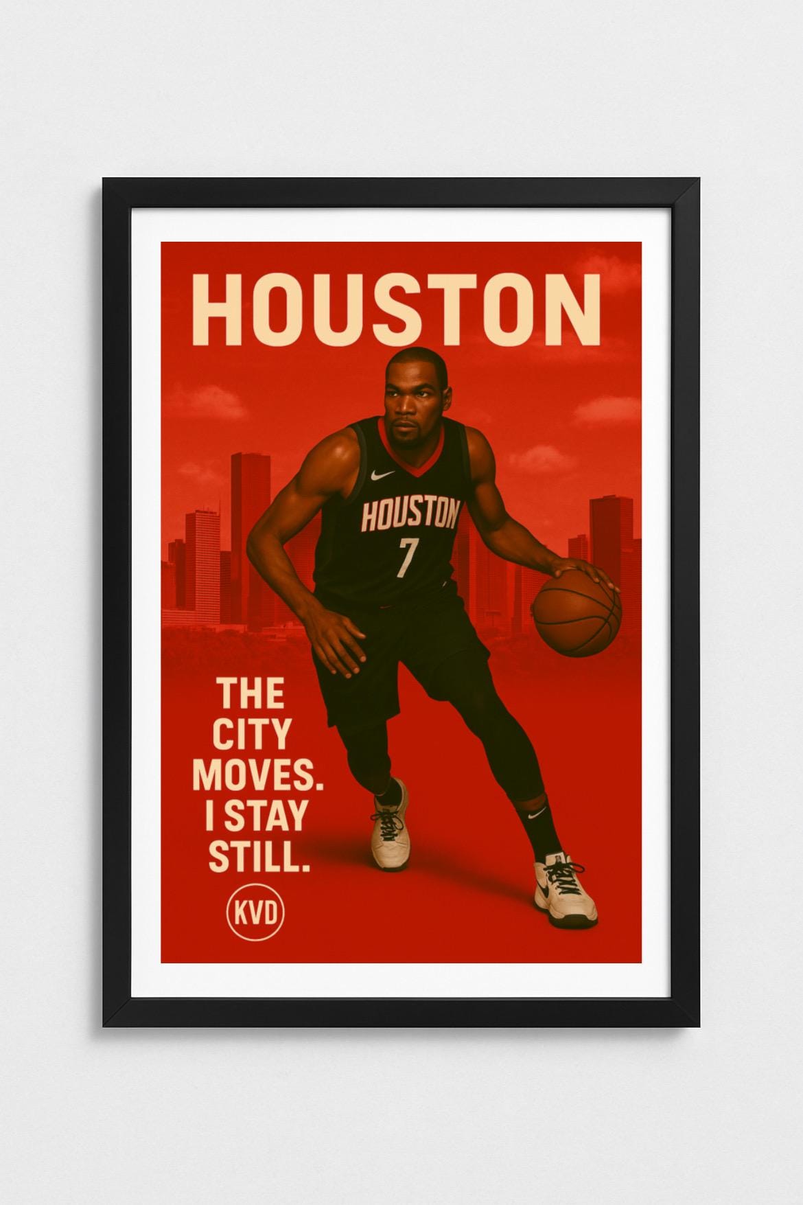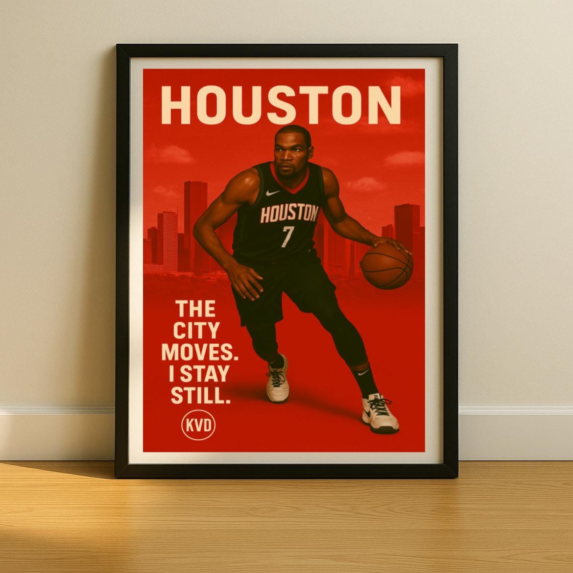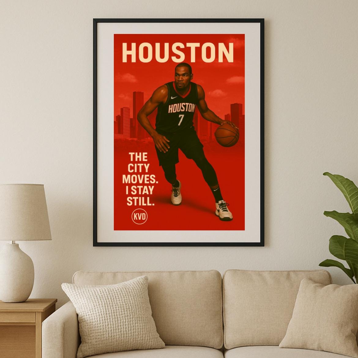 Stillness in the chaos. This illustrated realism piece captures Kevin Durant locked in as the Houston skyline glows behind him. A visual statement for those who stay calm under pressure.