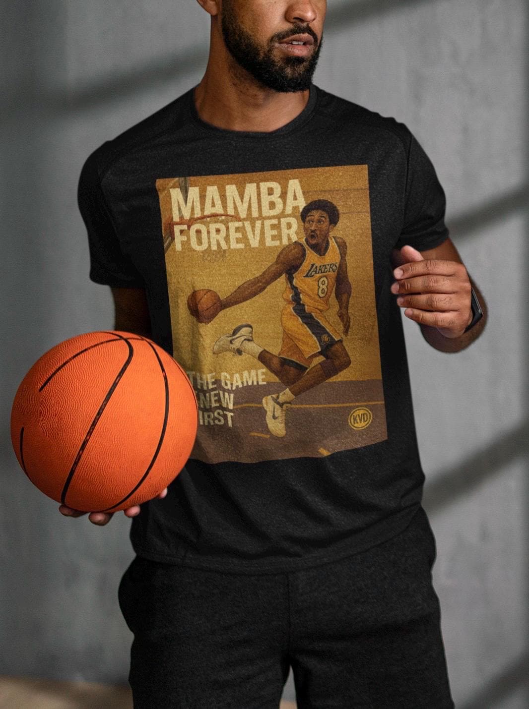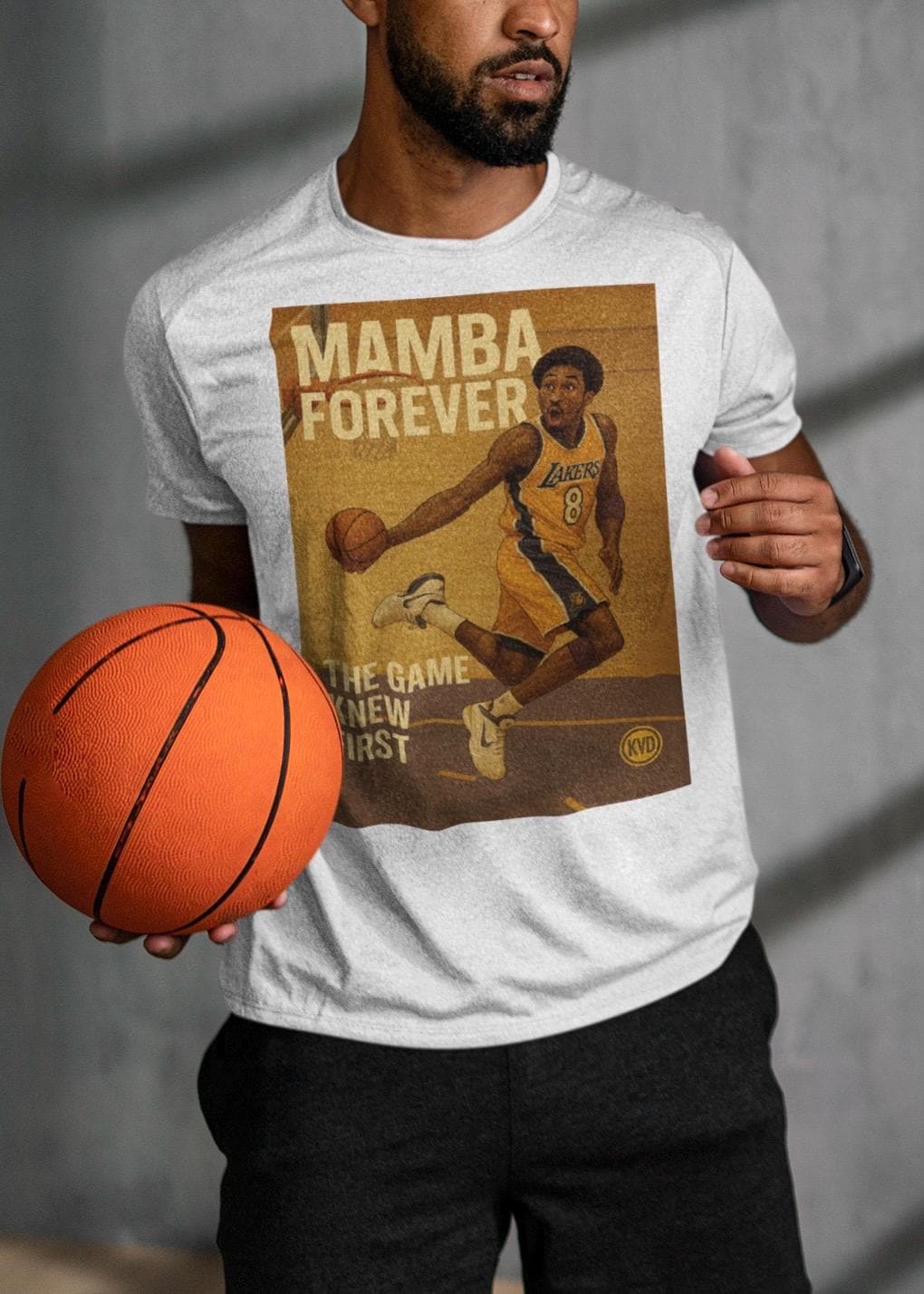 Step into the Mamba Forever Collection with this sports graphic tee. A legend basketball shirt designed with illustrated realism artwork, built for athletes and fans.