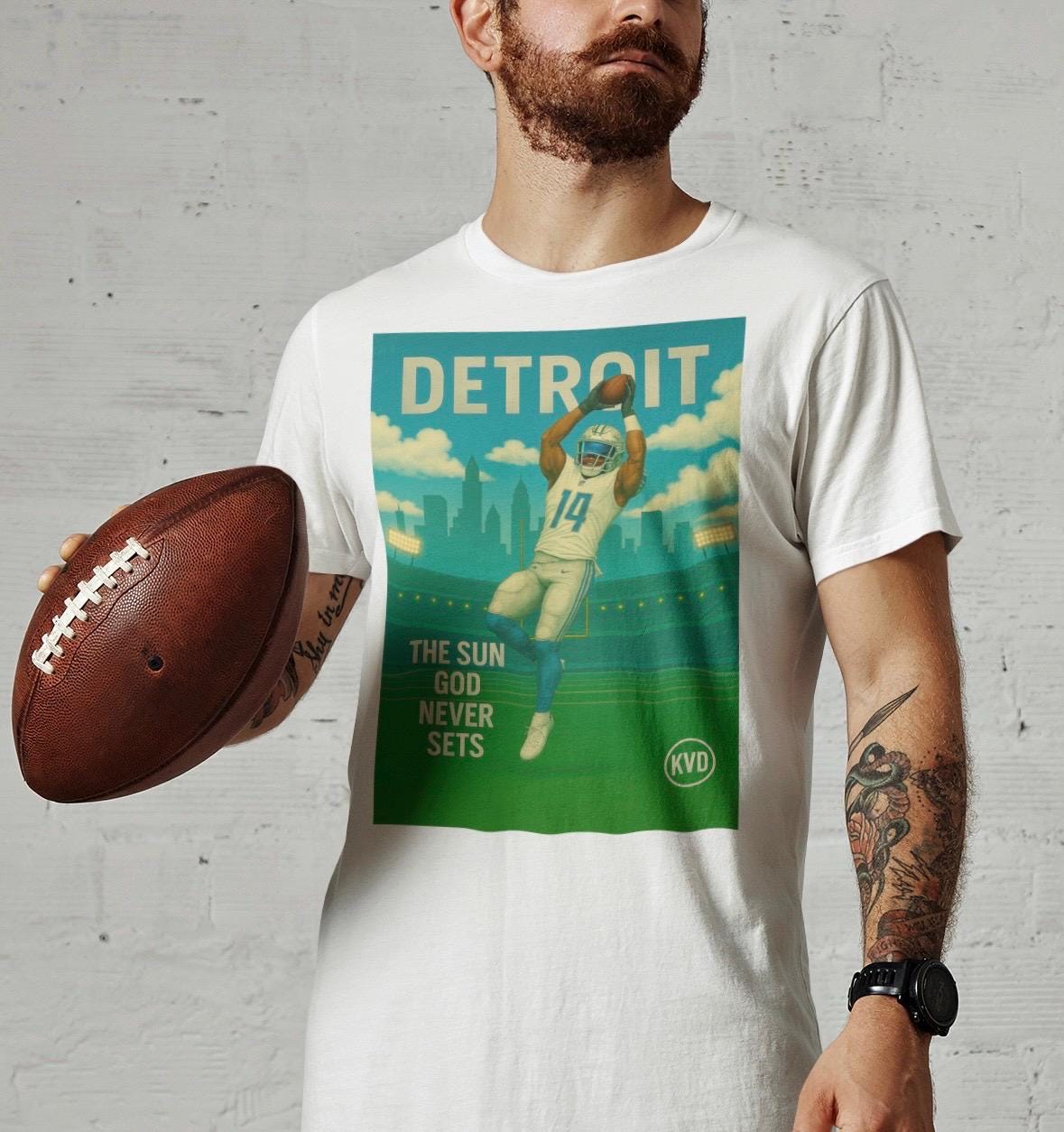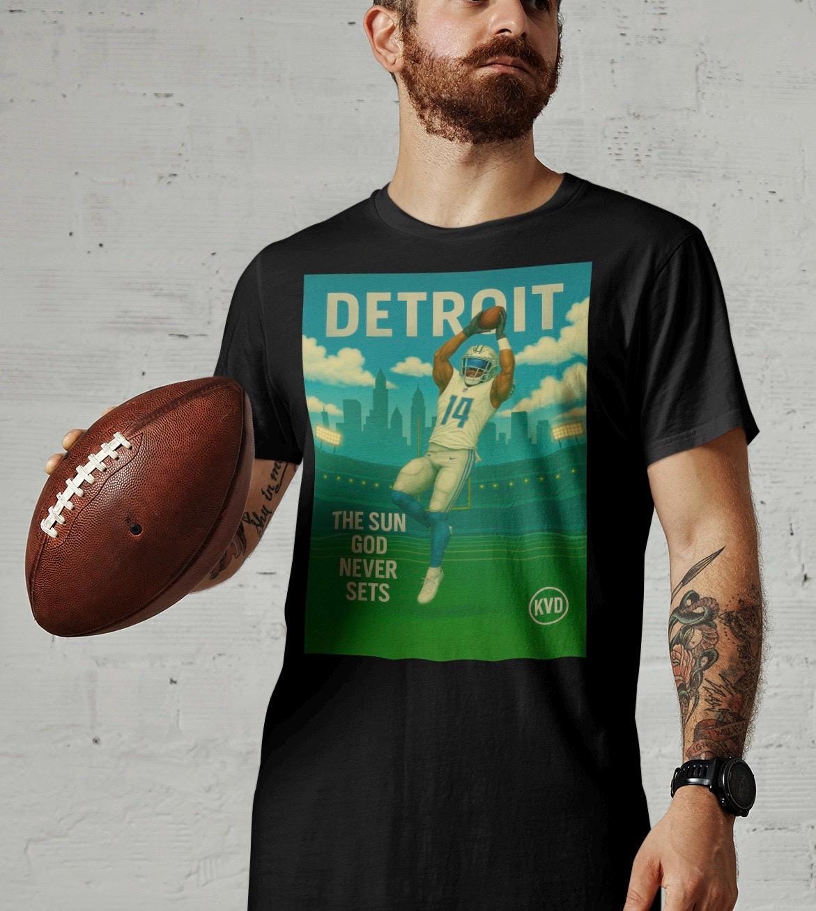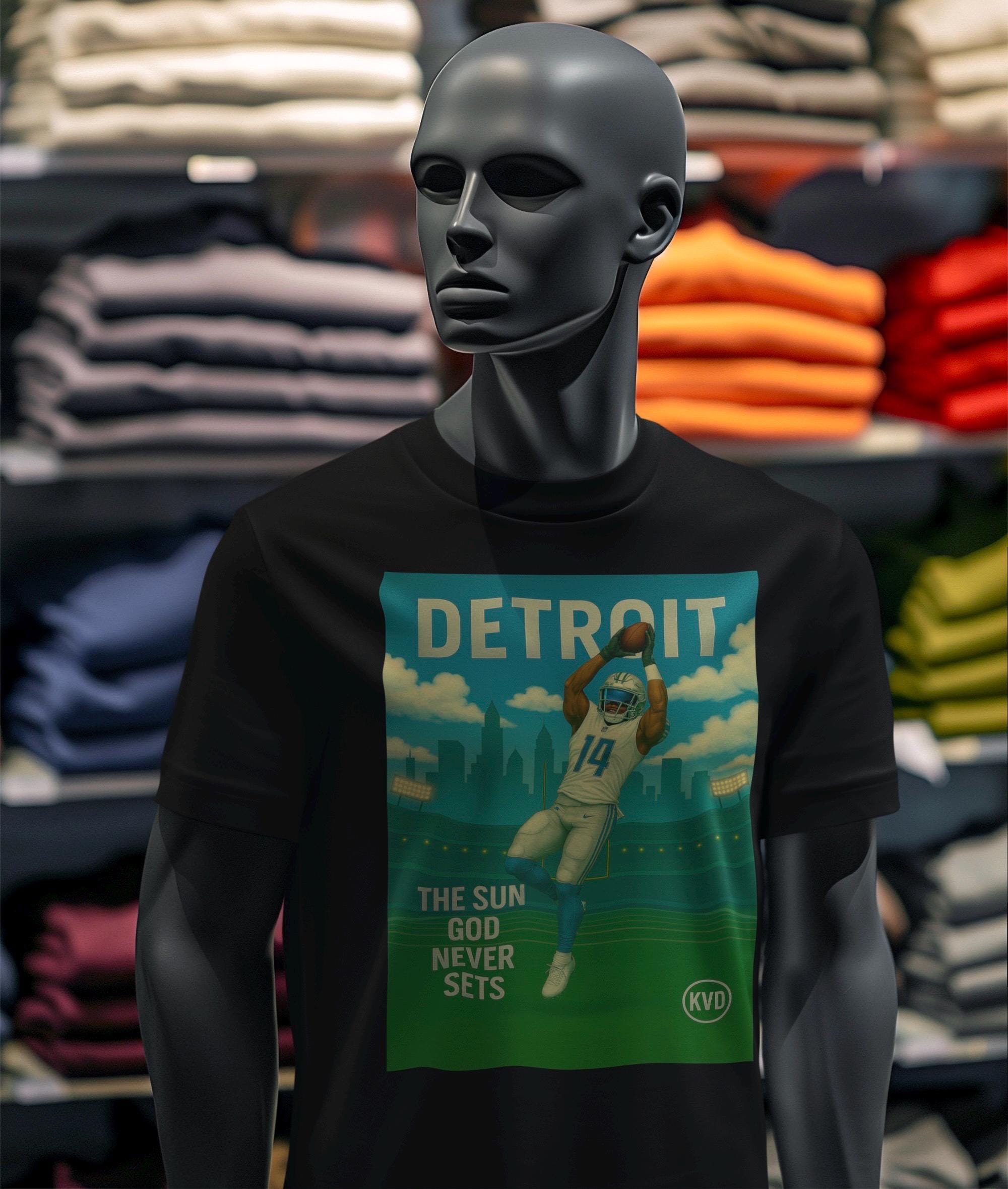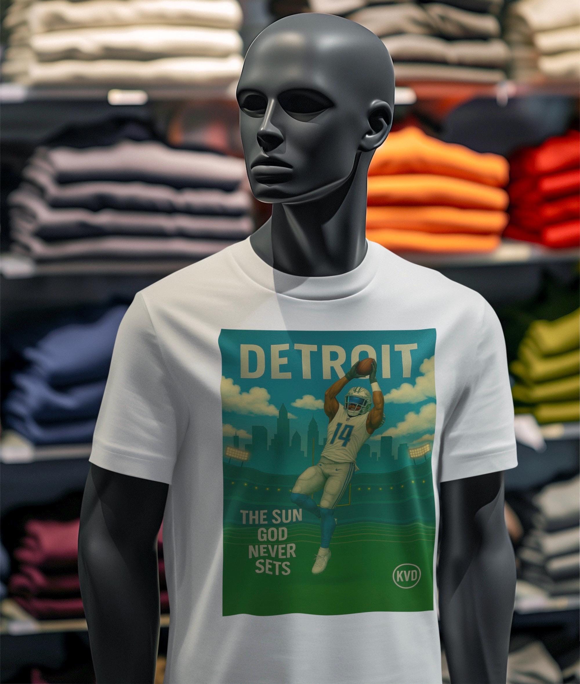 DET – Detroit Football Graphic Tee – “The Sun God Never Sets” – Pro Gridiron Streetwear T-Shirt • Urban Graphic Art • Sports Fan Gift